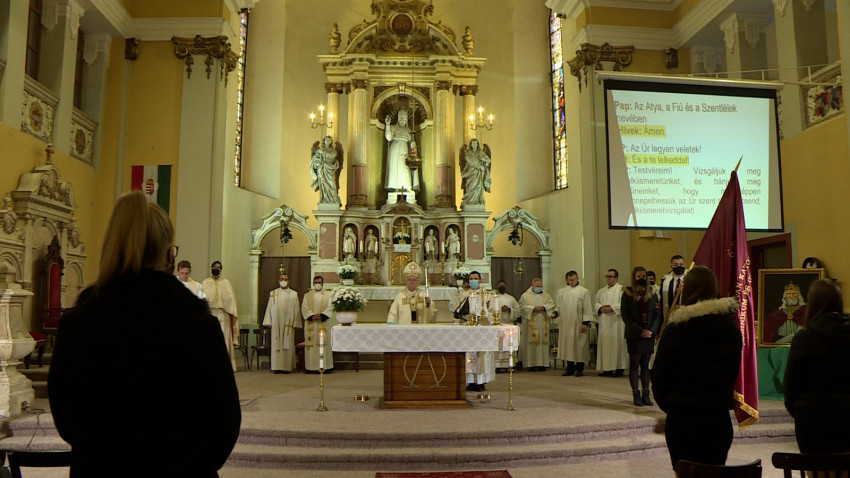 A szentmise előtt Lóczi Tamás plébános, iskolalelkész köszöntötte a főpásztort, majd felkérte, hogy áldja meg az iskolazászlót és az iskola védőszentjéről, Szent Istvánról készült festményt, és mutassa be a szentmisét.