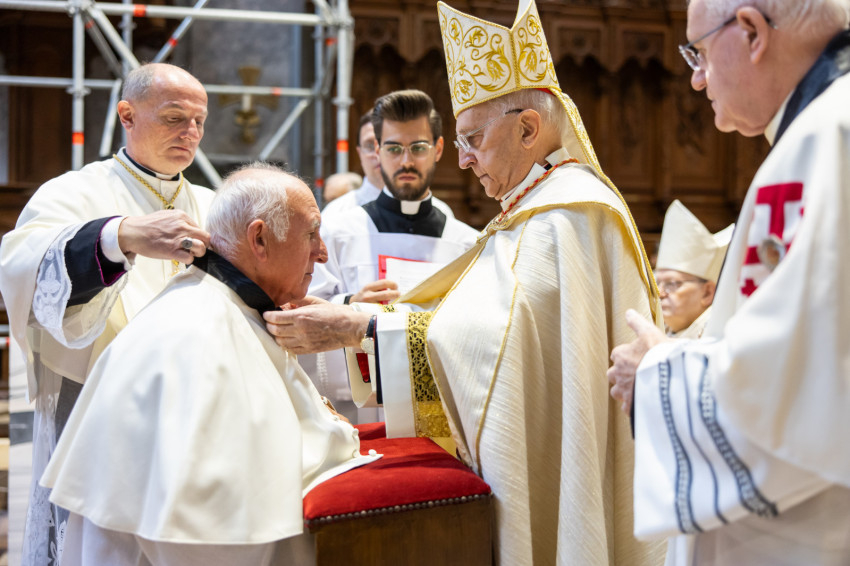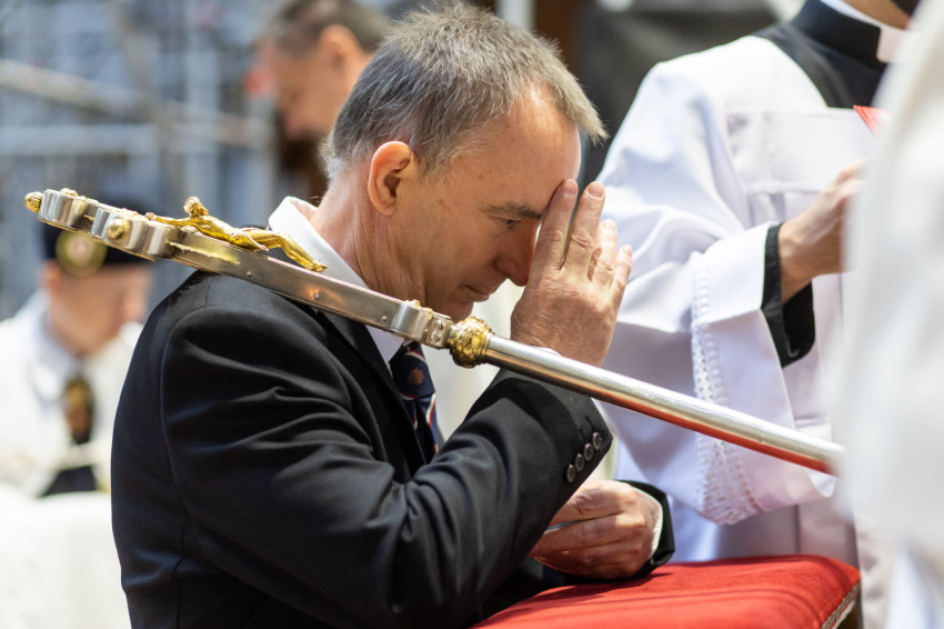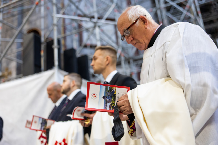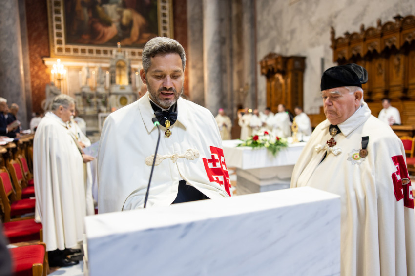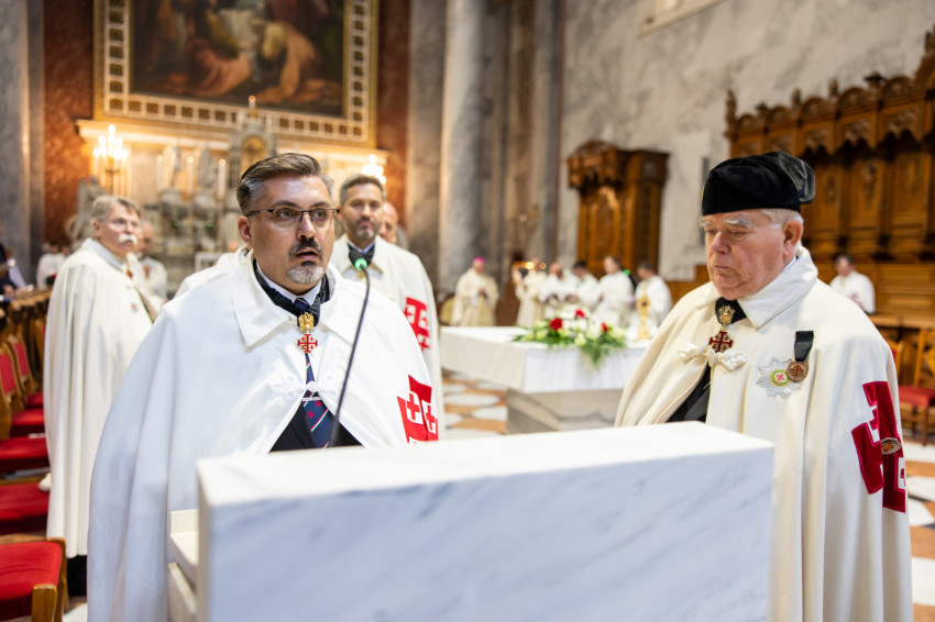 A mai szertartással kiteljesítettük az invesztitúra szertartását, melyet tegnap este kezdtünk meg az ünnepélyes imavirrasztással. Ma lett szentesítve az új lovagok felvétele a Jeruzsálemi Szent Sír Lovagrendbe a rendi kereszt felvételével és a nagymester áldásával, valamint a köpeny felöltésével, a rendi vezetők segítségével. A köpeny a mi díszruhánk és a rend jelvényével ékes: a jeruzsálemi ötös kereszttel. Ünnepélyes pillanatot élünk át tehát, amely kitörölhetetlen marad életetekben. Még a nehéz időkben is emlékezzetek arra a kiváltságra, amelyet Krisztus az Egyház révén adott nektek, mert a Jeruzsálemi Szent Sír Rend tagjává lenni egy igazi és magasztos kiváltságot jelent; érezzétek át a rendi tagság megtiszteltetését és szépségét, és legyetek mindig méltók rá.