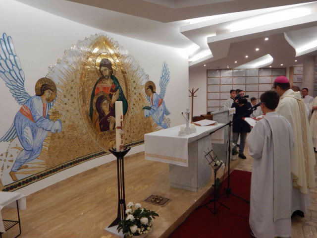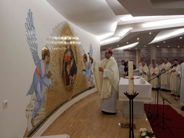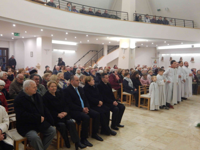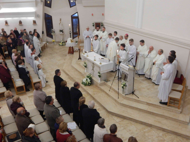 Már napközben is sokan betértek szentségimádásra a templomba, az esti órákban pedig folyamatosan érkeztek a hívek, várták az ünnepi szentmisét. A liturgia előtt az érdeklődők megtekinthettek egy kisfilmet, ami az altemplomot díszítő mozaik elkészülését mutatta be. Az ünnepi szentmise előtt Székely János megyéspüspök megáldotta a mozaikot.