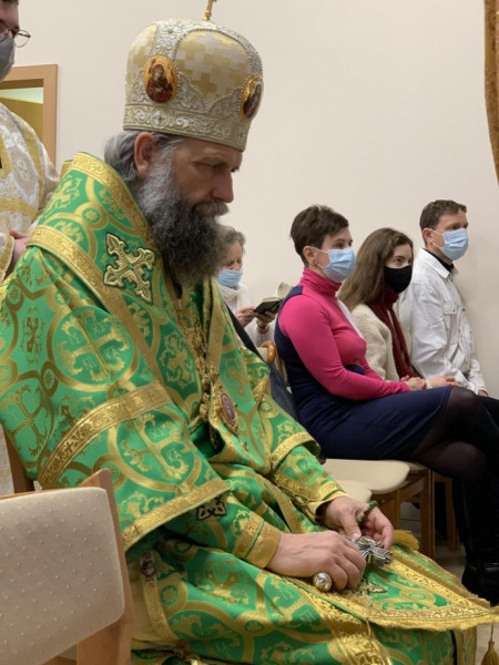 A Szent Liturgia előtt a főpásztor utrenyét végzett három budapesti görögkatolikus papnövendék segédletével.