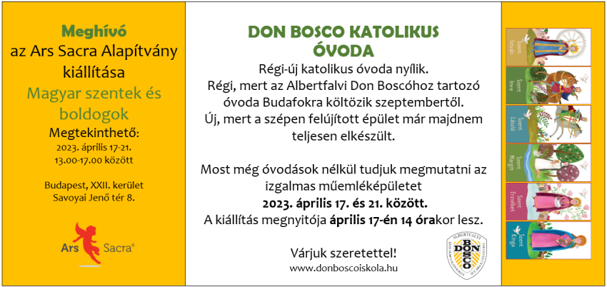 Bár az épület udvarán még munka folyik, az óvoda most mégis „kinyílik”: az érdeklődők egyelőre gyermekek nélkül tekinthetik meg az izgalmas és tágas közösségi tereket és nyerhetnek betekintést a műszaki megoldásokba is. A nyílt napokhoz kapcsolódóan az Ars Sacra Alapítvány Magyar szentek és boldogok című kiállítása is várja a látogatókat: április 17. és 21. között, hétfőtől péntekig 13 és 17 óra között. A kiállítás megnyitóján április 17-én, hétfőn 14 órakor Gyetván Gábor, az Esztergom-Budapesti Főegyházmegyei Katolikus Iskolák Főhatóságának főigazgatója, valamint Németh Zsolt országgyűlési képviselő, a külügyi bizottság elnöke mond beszédet. A tárlat megtekintése mellett a látványos épületet is bejárhatják az érdeklődők.