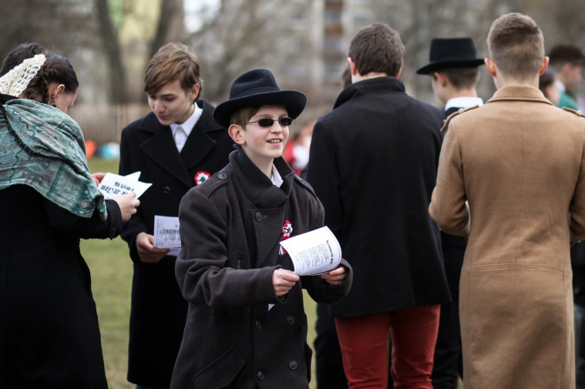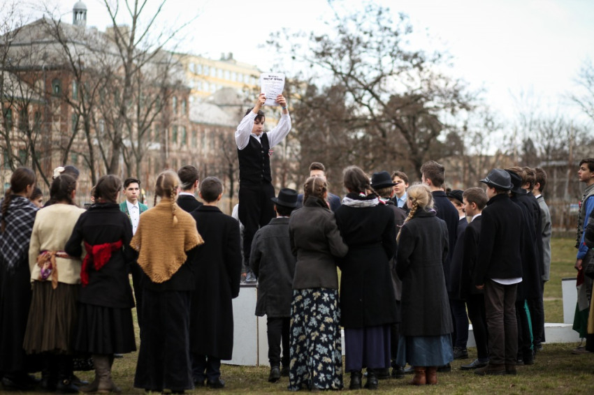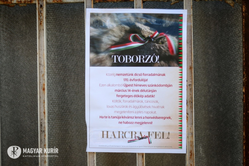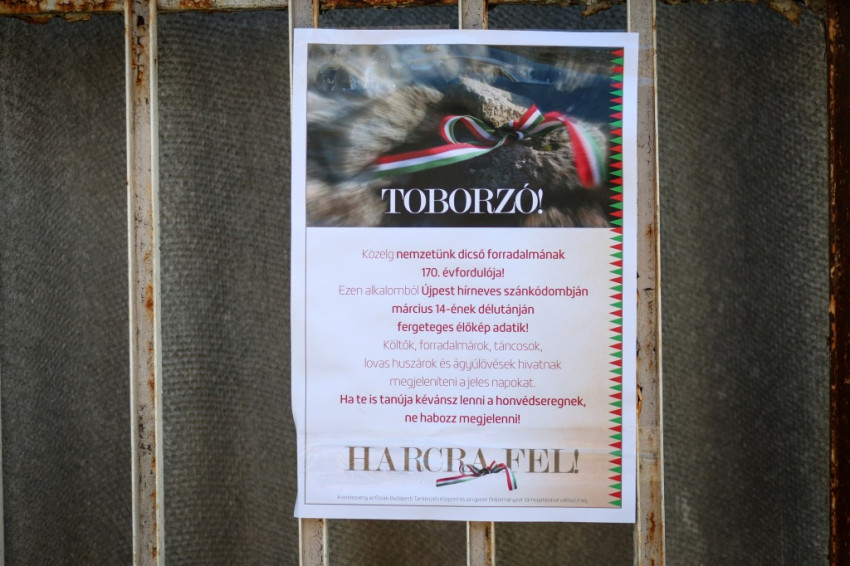 A márciusi ifjak már belepik a környéket, amikor az újpesti ünnepség helyszíne közelében leszállunk a buszról. A Görgey Artúr és a Corvin utca találkozása felé tartva egy kerítésre erősített szórólap állít meg: „Toborzó! Újpest hírneves szánkódombján fergeteges élőkép adatik. Költők, forradalmárok, táncosok hívatnak megjeleníteni a jeles napokat. Ha te is tagja kévánsz lenni a honvédseregnek, ne habozz megjelenni. Harcra fel!”