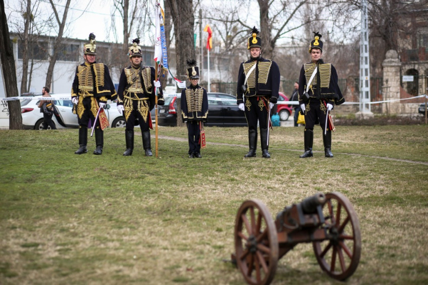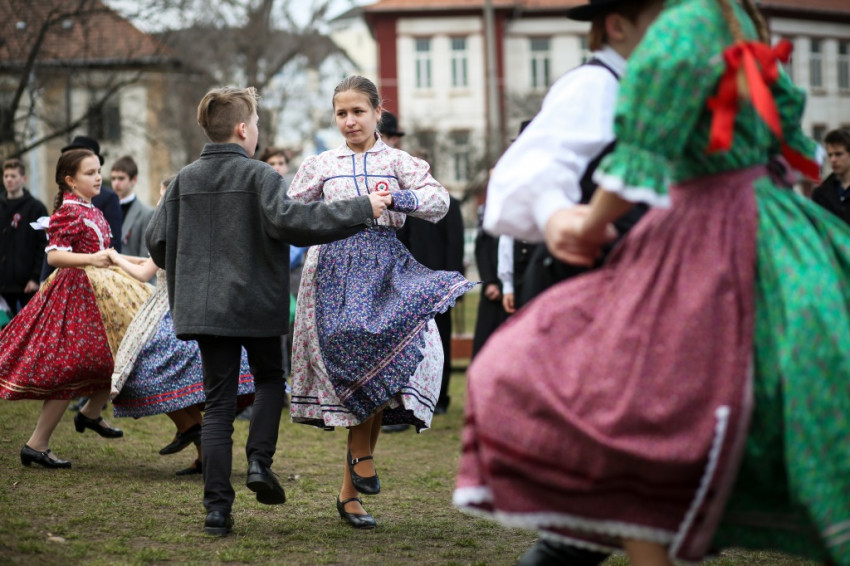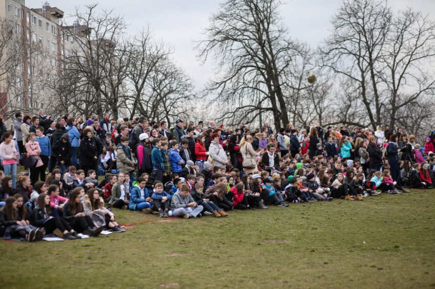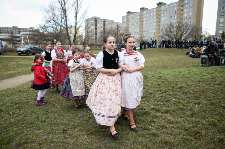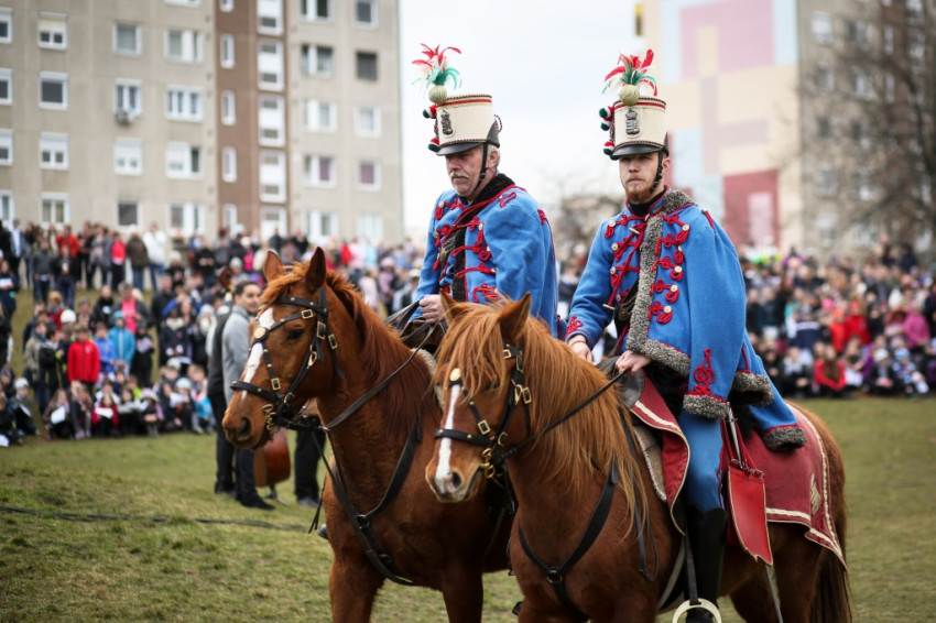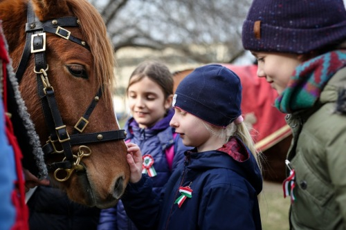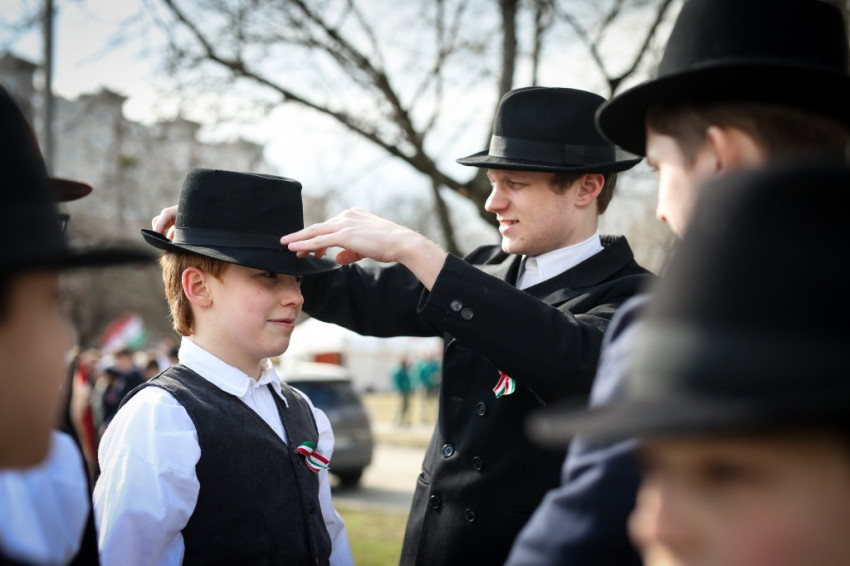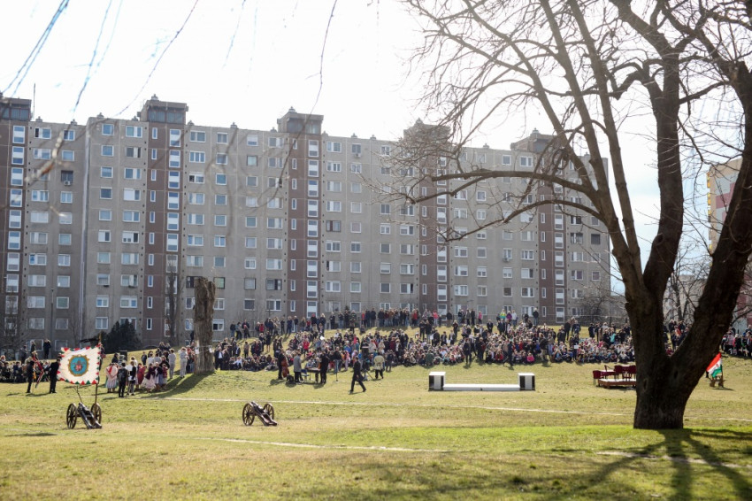 Nem habozunk, annál is kevésbé, mivel ekkor már előttünk a domb, és valóban hadseregnyi gyerek áll rajta kisebb-nagyobb csoportokban. Police feliratú szalagok között lépünk be a ma délután rövid időre 1848-ba visszatérő parkocskába: rendőrök, parasztjelmezes fiúk, néptáncos lányok, piciny ágyúk és huszárok között, majd a fúvószenekar mellett haladunk el a Fel, fel, vitézek, a csatára dallamára. Egykettőre a nagy nap hangulatának hatása alá kerülünk. Az ünnepségre érkezettek óriási tömege lenyűgöző. De az is eszembe jut: aki ilyen programot szervez, annak nagyon profin kell mozgatnia a résztvevőket, hogy minden rendben menjen.