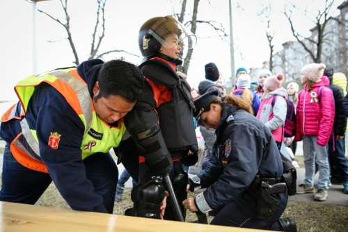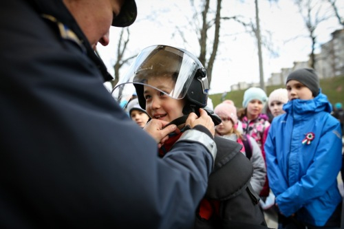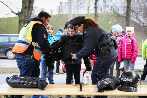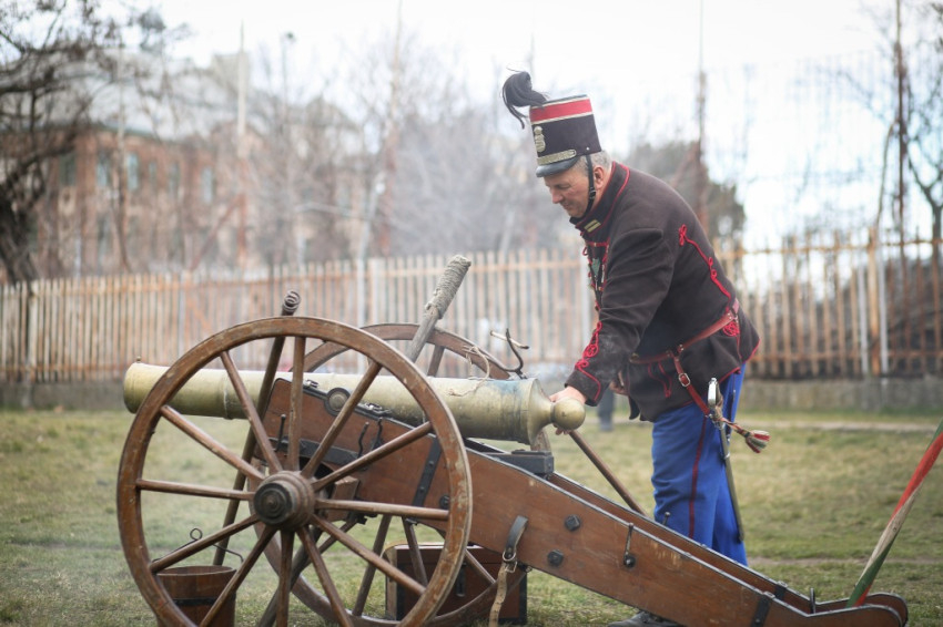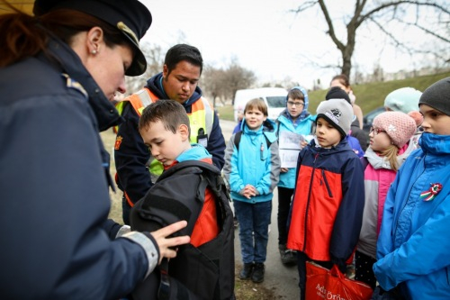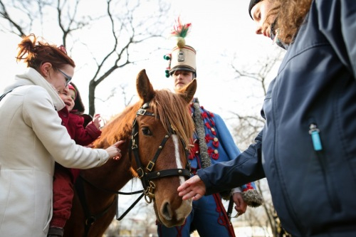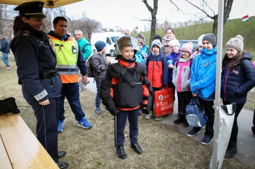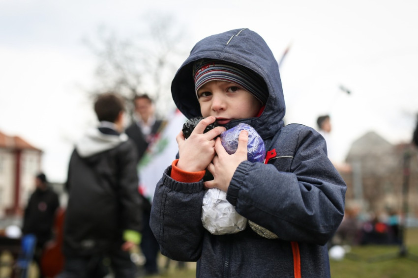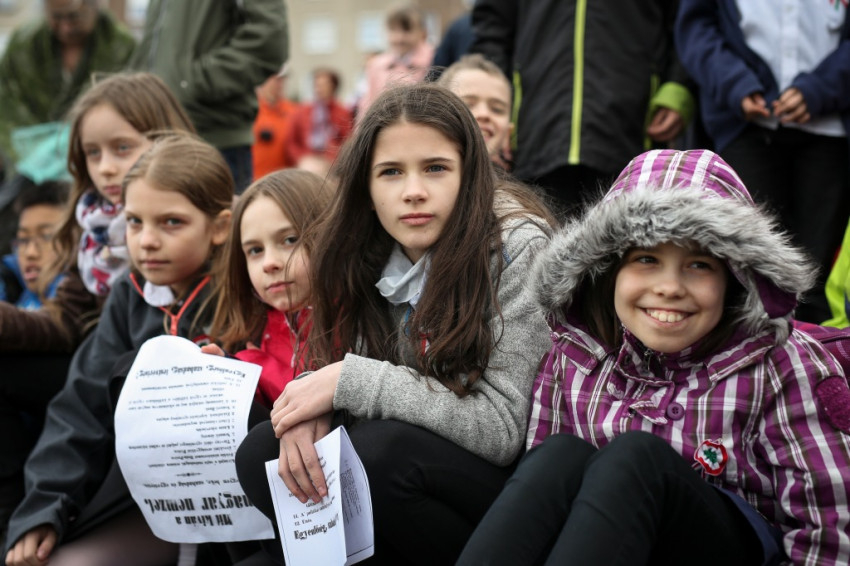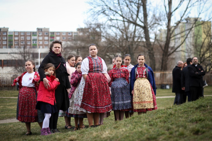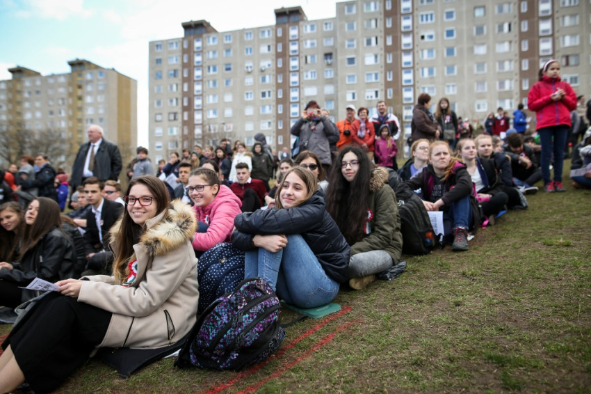 Nem habozunk, annál is kevésbé, mivel ekkor már előttünk a domb, és valóban hadseregnyi gyerek áll rajta kisebb-nagyobb csoportokban. Police feliratú szalagok között lépünk be a ma délután rövid időre 1848-ba visszatérő parkocskába: rendőrök, parasztjelmezes fiúk, néptáncos lányok, piciny ágyúk és huszárok között, majd a fúvószenekar mellett haladunk el a Fel, fel, vitézek, a csatára dallamára. Egykettőre a nagy nap hangulatának hatása alá kerülünk. Az ünnepségre érkezettek óriási tömege lenyűgöző. De az is eszembe jut: aki ilyen programot szervez, annak nagyon profin kell mozgatnia a résztvevőket, hogy minden rendben menjen.