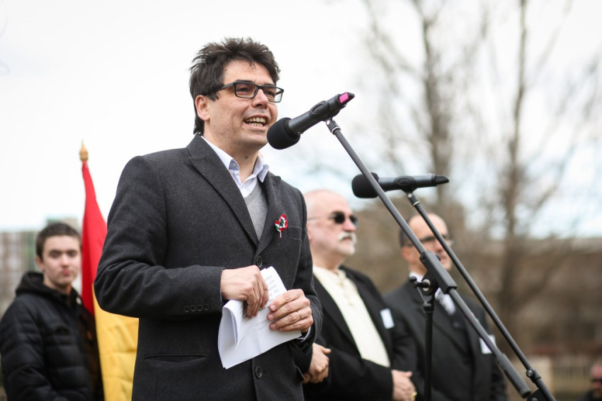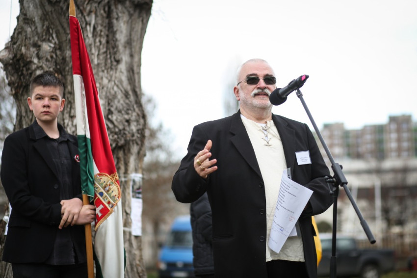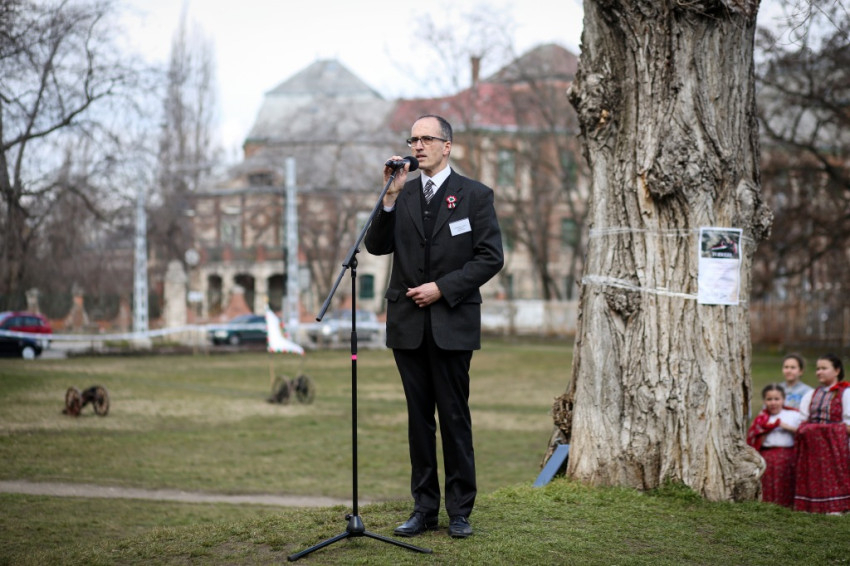 Az Újpesti Károlyi István Általános Iskola és Gimnázium, az egyik szervező intézmény igazgatója, Hirmann László dicséretesen rövid beszédet mond – gondolom, hogy ki ne zökkenjünk a forradalmi hangulatból. Megköszöni a Szent János Apostol Katolikus Általános Iskola és Óvoda igazgatója, Käfer György rendhagyó kezdeményezését, és annak a reményének ad hangot, hogy a mai ünnepség sokak számára életre szóló élmény lesz. Tizenkilenc iskola fogadta el a meghívást; a cél az, hogy a megjelentek az 170 éve lezajlott események tevékeny résztvevőinek érezhessék magukat. Ennek egy csata is része lesz – amelyet a magyarok sajnos elbuknak; az igazgató mindenkit arra kér, hogy kellő komolysággal, méltósággal vegyen részt a megvívásában.