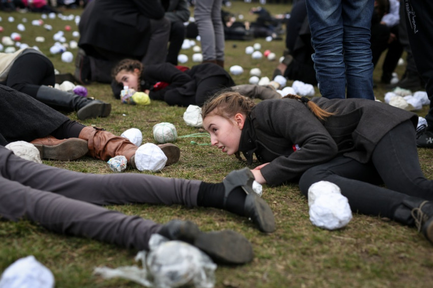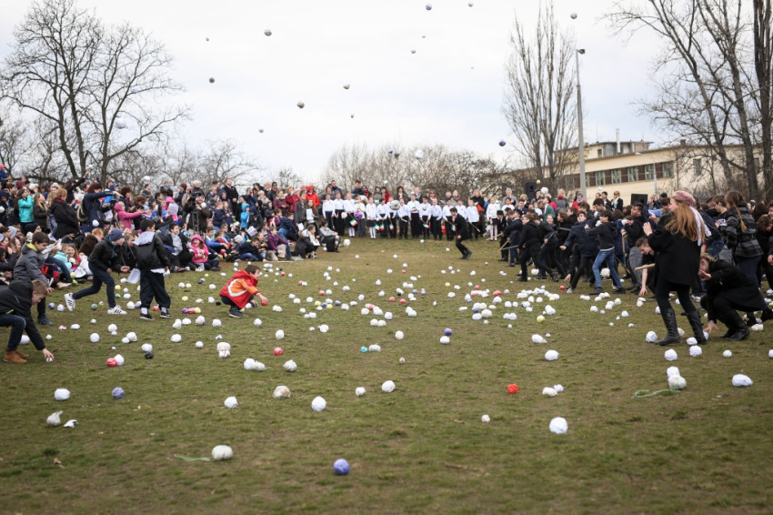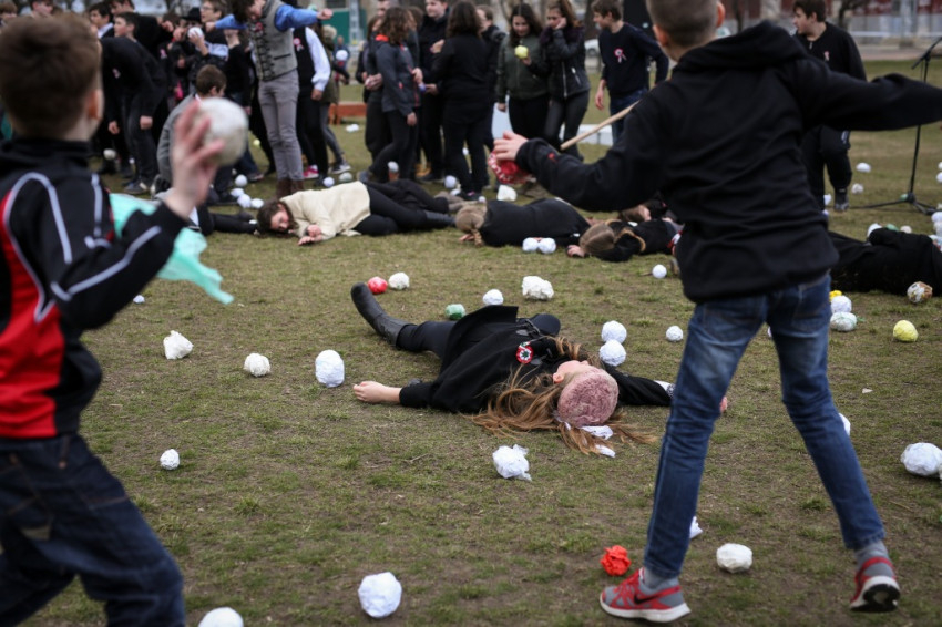 Nagy, ragasztószalaggal vagy zsineggel körbetekert, fehér, sárga, lila, piros és kék papírgombócokkal dobálják egymást a katonák. A magyar oldal körülbelül öt perc után sajnos alulmarad, és jó pár elesett vitéz fekszik a harctéren, amikor lezárul az ütközet. A társaik gyászzene kíséretében zászlócskák szúrnak a földbe melléjük. Aztán kézen fogva körbejárják őket.