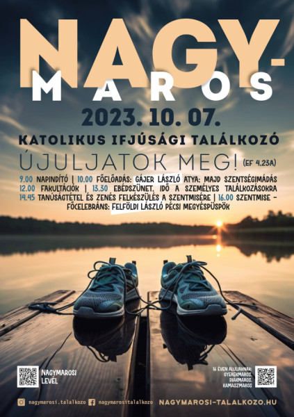 A Nagymarosi Ifjúsági Találkozó szervezői arra hívnak, hogy október 7-én előadóik, műhelyvezetőik segítségével figyeljünk együtt a bensőnkben szüntelenül szóló meghívásra: Újuljatok meg!
