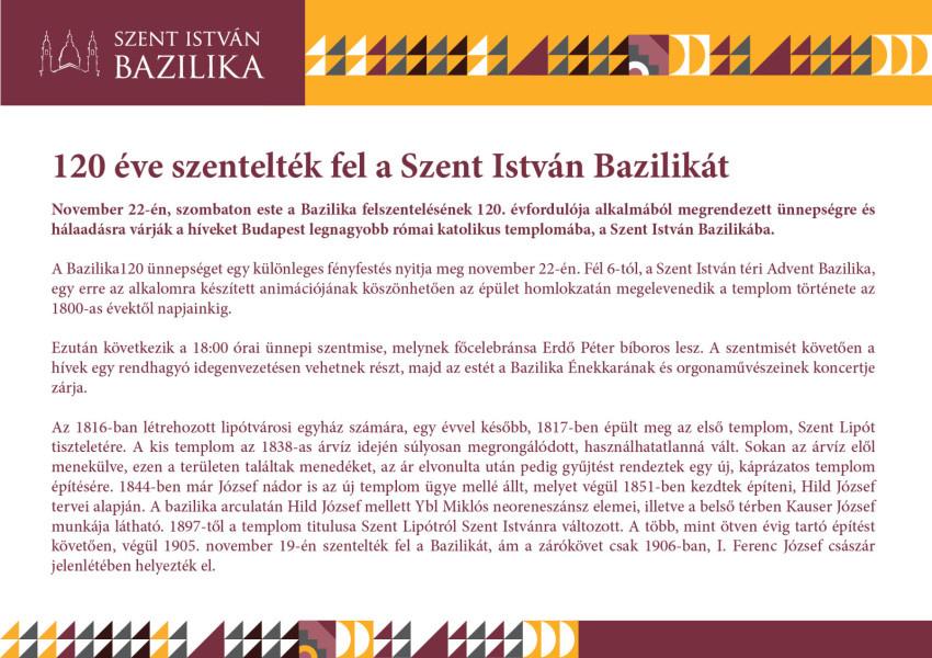 A Bazilika120 ünnepség különleges fényfestéssel nyílik meg november 22-én: 17.30-tól a Szent István téri „Advent Bazilika” rendezvénysorozat erre az alkalomra készített animációjának köszönhetően az épület homlokzatán megelevenedik a templom története az 1800-as évektől napjainkig.
