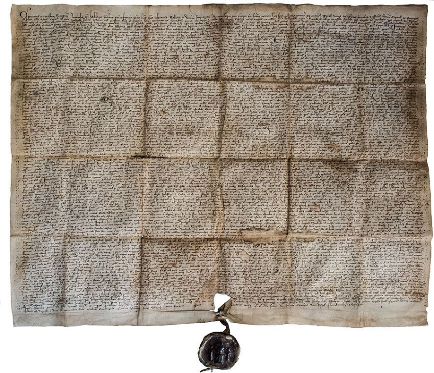 Az alapító okirat 1404-es másolatáról készült kétméteres, magyarázatokkal ellátott nagyítás fogadja a székesegyházba betérőket a nyugati kapunál.