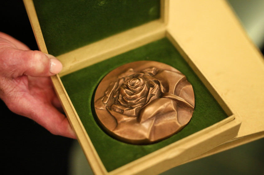 Hermann István a Szent Erzsébet rózsája díj átadásának emléket állító bélyegív bekeretezett díszpéldányával kedveskedik a díjazottaknak.