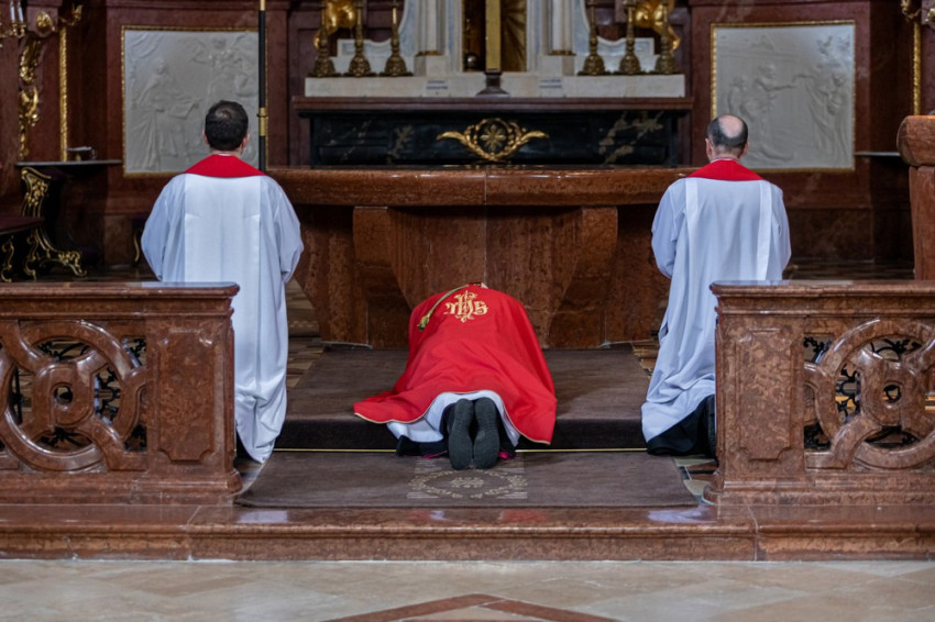Az ősi hagyomány szerint a Jézust jelképező oltár díszek nélkül, lecsupaszítva állt a Szent Imre-templomban. A főpásztor és a ministránsok csendben vonultak be a templomba, majd a püspök leborult az oltár, az önmagát kiüresítő Krisztus jelképe előtt.