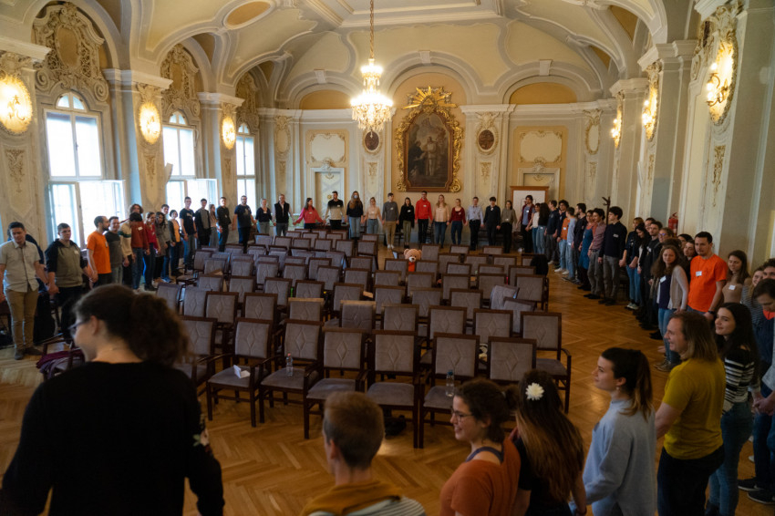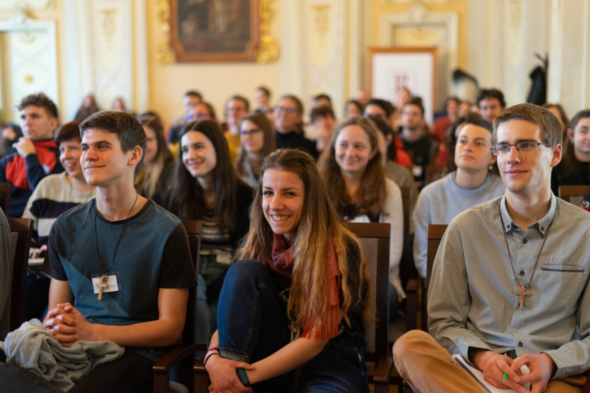 Április 1-jén újra megtelt velünk, fiatalokkal a Szent Imre Gimnázium impozáns díszterme, nem kisebb reménységgel, mint hogy a Szent Imre Antióchia Közösség fennállásának 26. évében megrendezett 50. hétvégét ünnepelhessük meg együtt. A hétvégék kitüntetett alkalomnak számítanak, hiszen ilyenkor lehetőség nyílik új tagoknak is a csatlakozásra, és az együtt töltött két és fél nap alatt a közösség még inkább össze tud kovácsolódni. A jubileumi eseményen 62 régenc és 25 újonc vett részt két szülőpárunk kíséretében, valamint egy nyolctagú angyalcsapat is serénykedett a háttérben, akik – többek között – az állandó betevőről gondoskodtak.