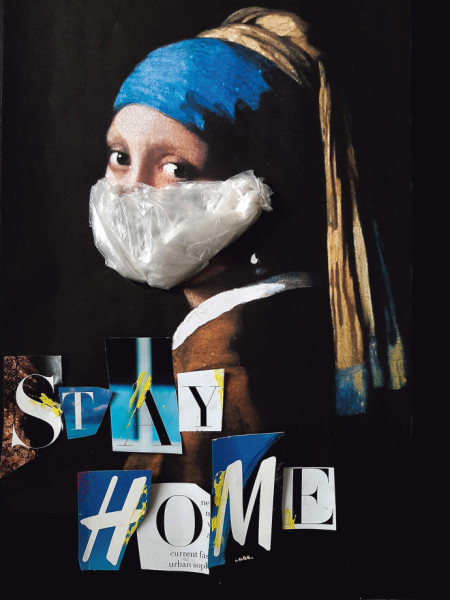 Rendhagyó házi feladatában Péteri Noémi is átalakított egy világhírű festményt. Ő Jan Vermeer van Delft 17. századi holland festőnek, a bensőséges női portrék legnagyobb mesterének egyik képét alkalmazta a mi 2020-as élethelyzetünkre, a jelenkori Hollandiára is érvényesen. A Leány gyöngy fülbevalóval, a hágai királyi galéria, a Maurits-ház egyik legértékesebb kincse. Péteri Noémi alkotása azonban most nem a festményt és nem is a 2004-ben forgatott, azonos című, Colin Firth és Scarlett Johansson főszereplésével készült film világát idézi. Ez az alkotás is szegényebb, kopárabb, mint az eredetije, hiszen a delfti mester gyönyörű modelljének sokak által megcsodált arcát hatalmas, szándékosan hevenyészett maszk takarja. A jókora „Stay home” felirattal megfejelt portré így a nyugalom helyett fenyegetettséget, zaklatottságot áraszt.