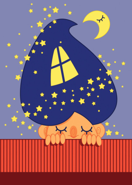 Az általam kiválasztott negyedik plakát Szeles Dorottya „Maradj otthon” üzenete. A képen egy kivilágított, barátságos házikó szinte búvárharangként vagy akár védősisakként borul egy mélyen alvó, seprős szempillájú kisgyerek fejére, aki talán pár perccel korábban mondta el esti imáját. Ez a kedves, de csöppet sem édeskés jelenet akár most, minden változtatás nélkül tökéletesen beleillene egy mesekönyv vagy meseregény világába.