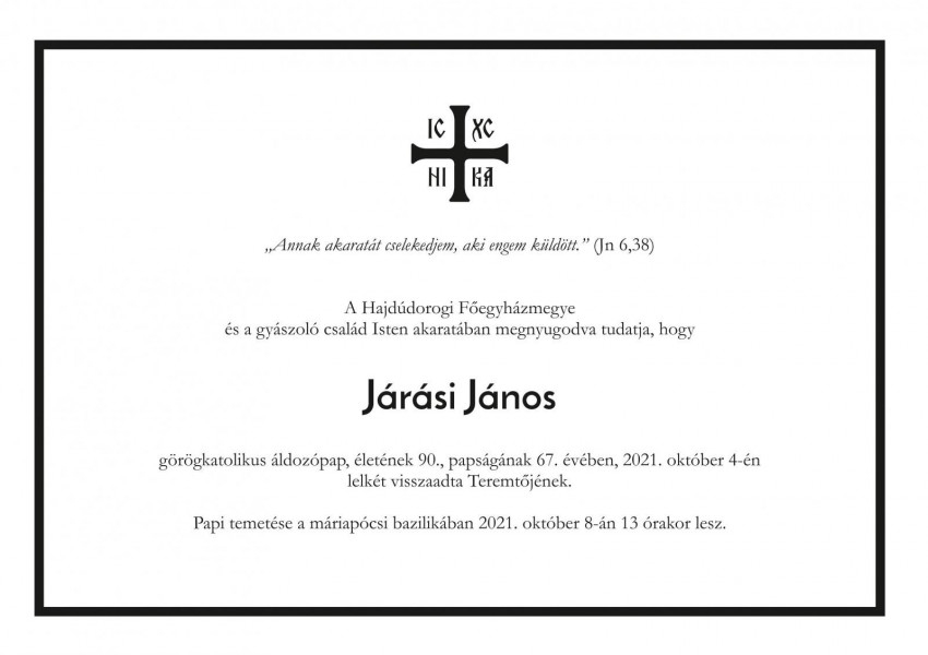 János atya örömmel hallgatta az 52. Nemzetközi Eucharisztikus Kongresszus rádión közvetített szertartásait, együtt énekelt a hívekkel. Úgy élt, ahogyan papi jelmondatát is választotta: „Annak akaratát cselekedjem, aki engem küldött.” (Jn 6,38)