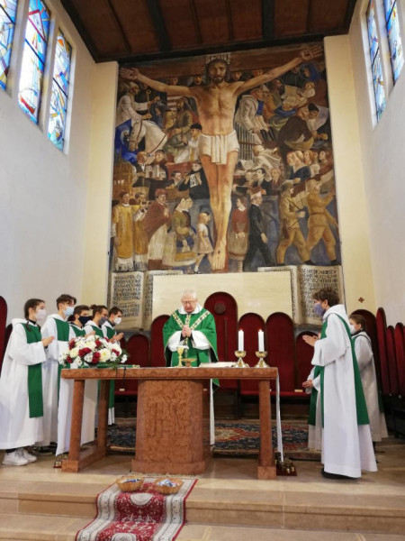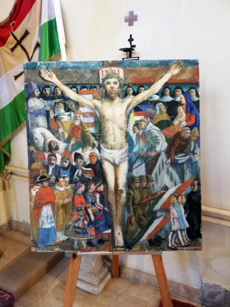 „1944-ben sorkatonai szolgálatát Ősz Dénes a kerületünkben töltötte – hallhattuk Tóth Avanti Pétertől – híradós katonaként, a budatétényi technikusok laktanyájában, ami a mostani tűzoltó toronynál volt. Ezalatt festette az akkor helyőrségi templomként funkcionáló plébániatemplomunkban látható monumentális falfestményét. A kép ikonográfiája a szokásostól eltérő, mert az élő Krisztus jelenik meg a keresztfán, a másik érdekesség, hogy a kép két részből áll: a felső rész hagyományos freskótechnikával készült, míg az alsó rész száraz vakolatra festett szekkó. Feltételezhető, hogy a front gyorsan közeledett, így a festő kénytelen volt gyorsabban dolgozni. A helyőrség parancsnoka Csikós Jenő ezredes volt, aki engedélyezte katonájának a kép elkészítését.”