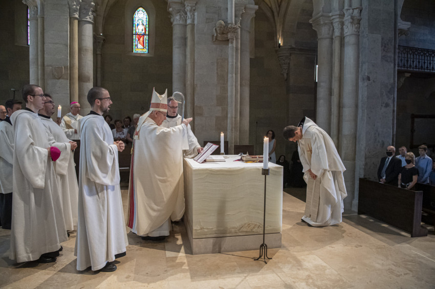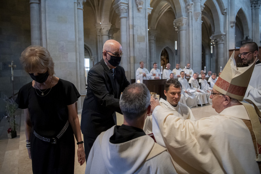 A homília után tett ígéretet Dávid testvér, majd Asztrik püspök, utána pedig a jelen lévő világi és szerzetes papok tették kezüket a felszentelt fejére. A kézrátételt követően hangzott el a felszentelő ima. Ezután öltözött be a miseruhába a testvér, majd tenyerét Asztrik atya krizmával kente meg, és átadta neki a szent kelyheket, amelyek a nép adományait testesítik meg. Végül előbb a szentelő püspökkel, majd a papokkal is békecsókot váltó Dávid atya már felszentelt papként vett részt az Eucharisztia szertartásában.