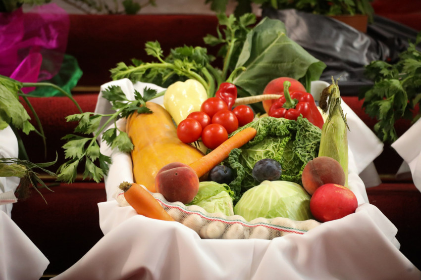 Előkészítettük megáldásra a föld terméseit és gyümölcseit. Nem véletlen ez, hiszen minden szentmisében a szentség anyaga a kenyér és a bor. Ebből lesz Krisztus teste és vére. Tehát