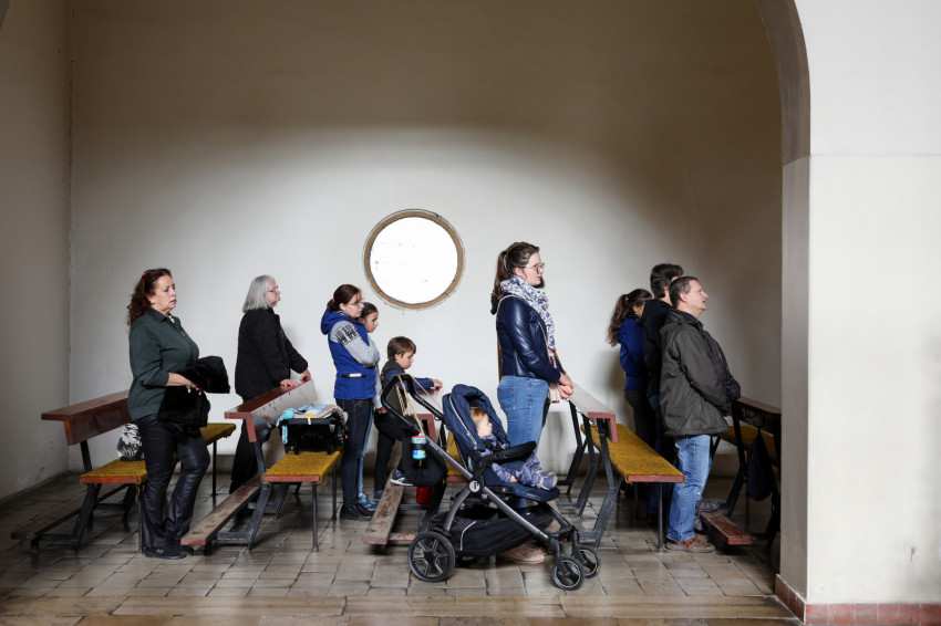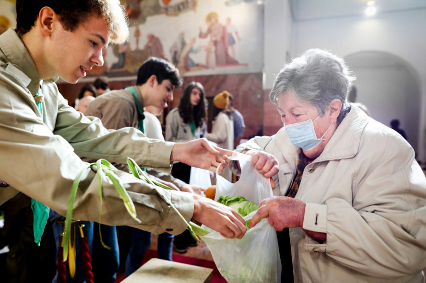 A liturgia végén a templomban, ahol gyakorlatilag minden egy hatalmas térben van, hiszen a három hajó csak jelképes, megkezdődött a láthatóan friss zöldségek és gyümölcsök szétosztása. Kettes sorokban érkeztek a hívek az oltár asztalához, ahol a cserkészek és a ministránsok kiosztották a kiporciózott terményeket. Jól tették Béla atyáék, hogy sokat vásároltak, így jutott mindenkinek, akik sorba álltak érte.