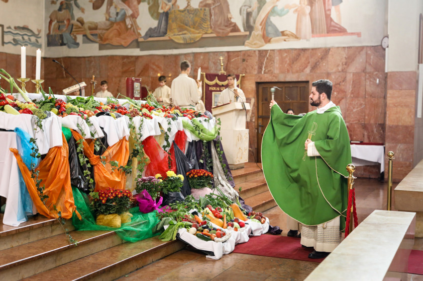 Utal is rá a felajánlási imádság, amelyben azt mondjuk: hálát adunk Istennek, hogy az Ő bőkezűségéből kaptuk a kenyeret, felajánljuk, mint a föld termését és az emberi munka gyümölcsét – és ezt ezen a vasárnapon, mint szerte a világban, mi is megköszönjük.
