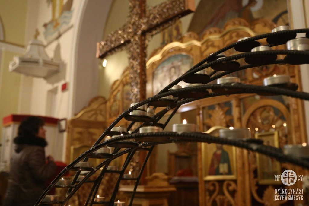 Az este hat órától kezdődő második Előszenteltek Liturgiáján is megtelt a templom hívekkel. Ez egyúttal lelkigyakorlatos alkalom is volt (a másnapi délelőtti szertartással együtt), melyen Ivancsó Sándor nyírcsaholyi parókus mondott homíliát. Az életadó kereszt és az örök életre szóló táplálék, az Eucharisztia összefüggéseiről beszélt. „A kereszt – mint mondta – az elmélet útját mutatja, az Eucharisztia, melyet magunkhoz veszünk, a gyakorlati segítséget adja ahhoz, hogyan is juthatunk az Istenhez. Az Isten közelébe emelkedhetünk a kereszttel, de hogy ezt meg tudjuk tenni, táplálkoznunk kell.” A kereszt, a lépcső, a létra a föld és az ég összekötőjeként az Úrhoz vezető jelképek. Az Ószövetségből Jákob álmában is az életet, Isten jóváhagyását, megerősítését jelenti. Ő mondja, s vele együtt mi, akik itt állunk, mondhatjuk: „Az Úr van ezen a helyen” – fogalmazott a nyírcsaholyi parókus.