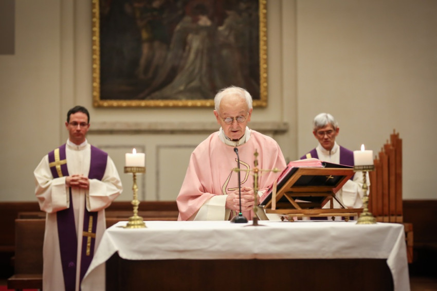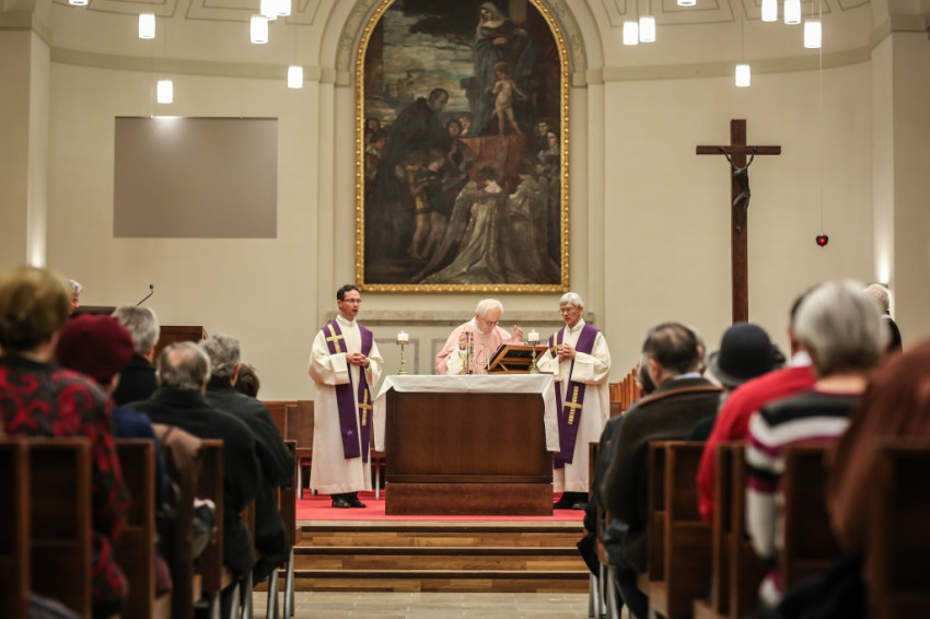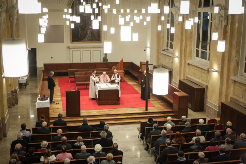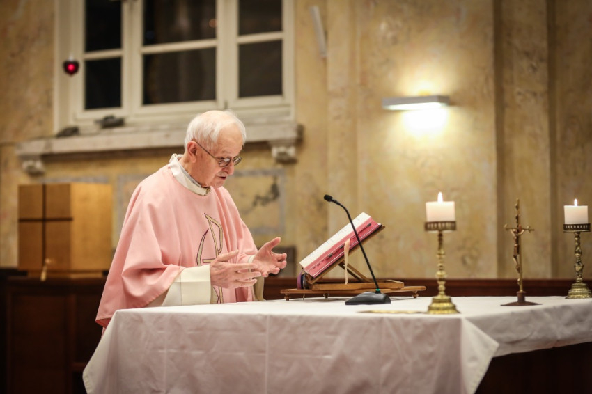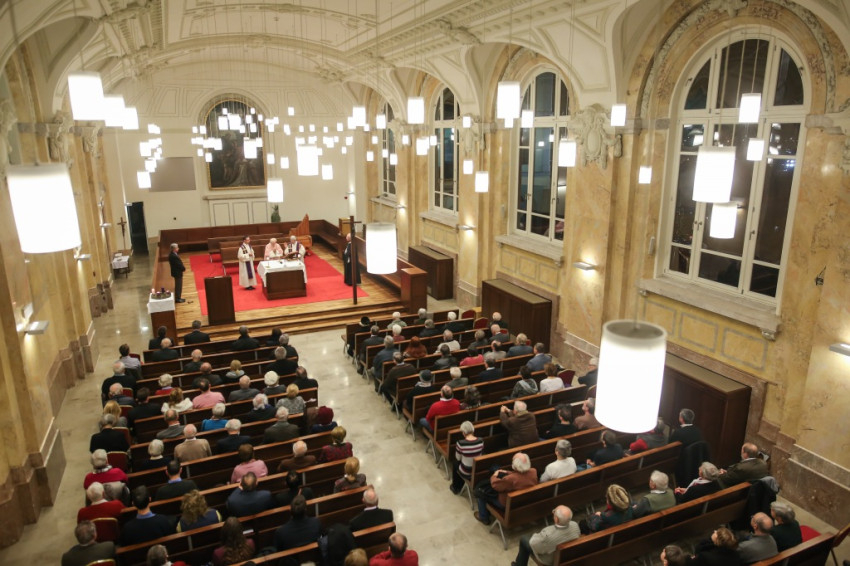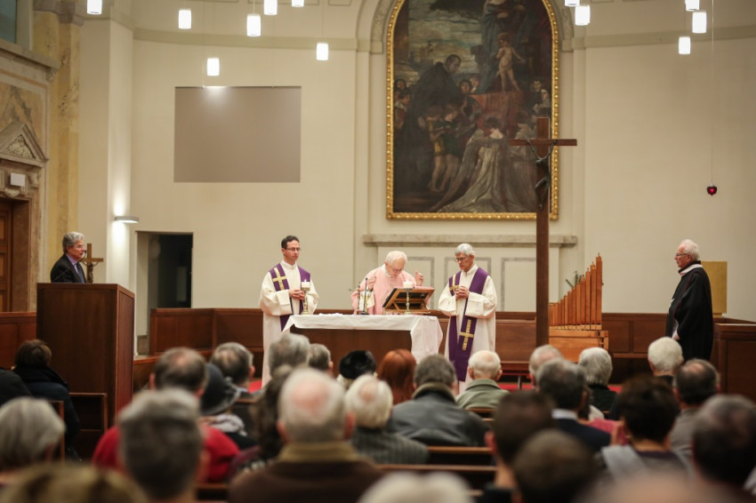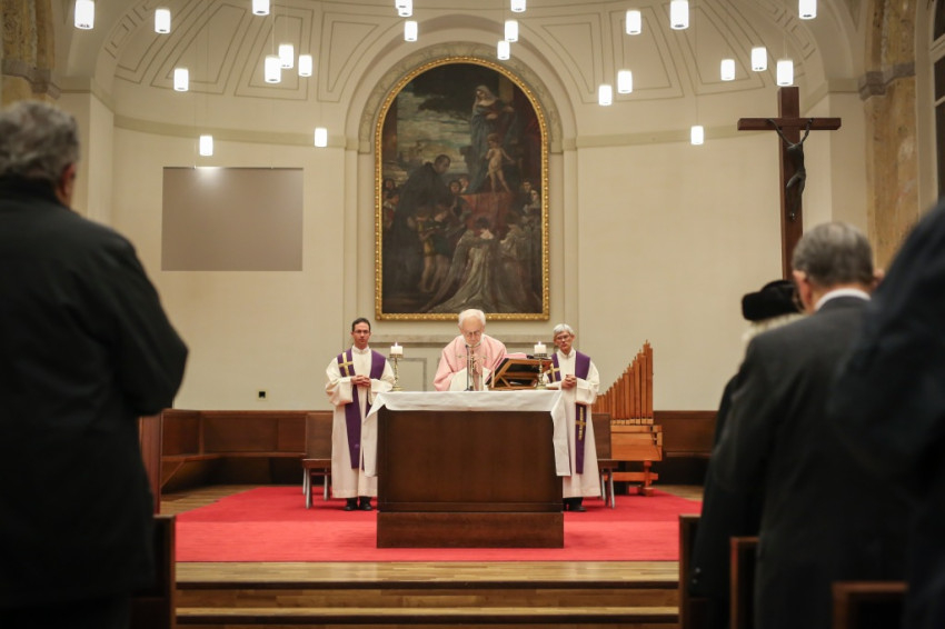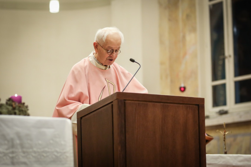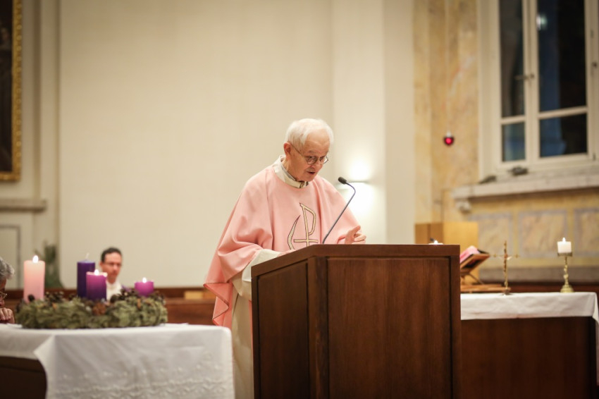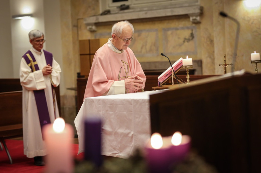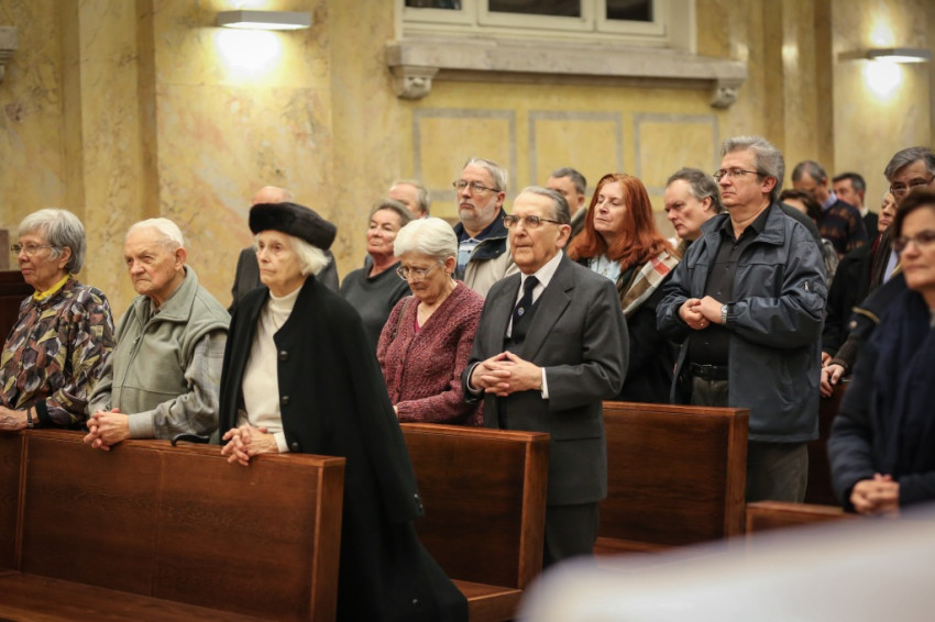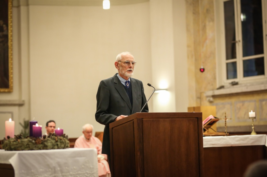 Advent harmadik vasárnapján örvendezésre szólít fel az Egyház, a piarista rend pedig összehívja az öregdiákjait, hogy együtt imádkozzanak az elhunyt diáktársakért és az élőkért, a családjaikért – mondta Jelenits István, aki előző nap, december 16-án ünnepelte 85. születésnapját. – 24 évvel ezelőtt egy hasonló alkalommal azért akartunk összegyűlni, hogy Antall József miniszterelnök gyógyulásáért imádkozzunk, de a mise előtt megérkezett a hír, hogy elhunyt. Így az a mise már a gyászmiséje lett. Ma azt kérjük, hogy a régi gyermekkori karácsonyok örömével emelje őt az Isten örömébe. A bevezető szavak után felolvassák az elmúlt időszakban elhunyt egykori piaristák nevét.