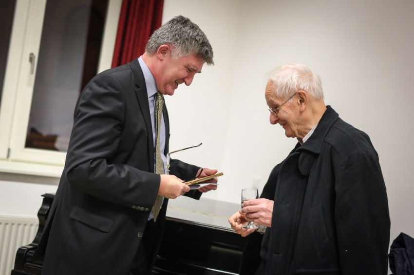 A mise után megkoszorúzták Antall József és az I. világháborúban elhunyt diáktársak emléktábláit, majd az üvegteremben gyűlt össze a vendégsereg, hogy az ünnepelt egészségére koccintson. Strommer Pál, a diákszövetség főtitkára szellemes beszédet mondott. Pilinszkyt idézte Jelenits atya jellemzésére: „Bölcsnek nevezném azt az embert, aki egyszerre tartja számon, és egyenlő erővel éli meg mindazt, amit tud, és mindazt, amit nem tud a világról.” Megköszönte, hogy Jelenits atya tanárként soha semmit nem fedett el az ellentmondásokból. Sztarecnek nevezné az ünnepeltet, mondta, ha annak nem az öreg lenne a jelentése: „de te már negyven éve is ilyen voltál”, tette hozzá, és ezzel nagy derültséget váltott ki. Aztán átadta az öregdiákok „jelképes” ajándékát: az első kiadású, Fiatalok, még itt vagyok! című Juhász Gyula-kötetet, amelyben egy Kalazanci Szent Józsefnek ajánlott vers is van.