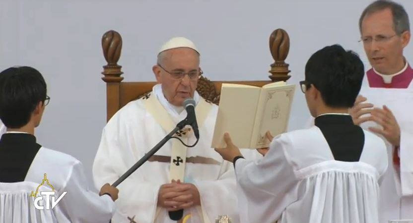 „A vértanúk dicsősége ragyog rátok!” – kezdte szentbeszédét a pápa, utalva az ifjúsági találkozó témájára. – „Ezek a szavak mindnyájunknak vigaszt nyújtanak, és megerősítenek bennünket. Ázsia fiataljai: nagy tanúságtétel, egy Krisztusba vetett értékes hitvallás örökösei vagytok. Ő a világ világossága, ő a mi életünk világossága. A koreai vértanúk – és a számtalan vértanú egész Ázsiában – átadták testüket üldözőiknek; örökös tanúságot tettek nekünk arról, hogy Krisztus világossága eloszlatja a sötétséget. Krisztus szeretete dicsőségesen győzedelmeskedik. A halál felett aratott győzelmének bizonyosságában, amelynek mi is részesei vagyunk, szembe tudunk nézni a keresztény tanítványok mai kihívásaival saját környezetünkben, a mi korunkban.