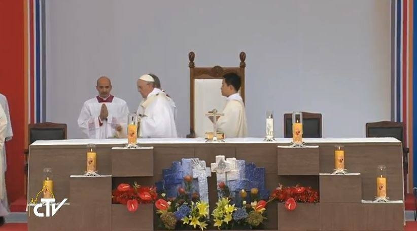Kedves ázsiai fiatalok! Abban reménykedem, hogy egységben Krisztussal és az Egyházzal, ezen az úton fogtok járni, amely biztosan sok örömet okoz nektek. Most, amikor az eucharisztikus asztalhoz közeledünk, forduljunk Mária Anyánkhoz, aki Jézust a világra hozta. Igen, Mária Anyánk, vágyakozunk Jézusra; anyai szereteteddel segíts nekünk, hogy elvigyük őt másoknak, hogy hűségesen szolgáljuk és tiszteljük őt mindenkor és mindenütt, ebben az országban és egész Ázsiában” – fejezte be a fiatalok napján mondott homíliáját Ferenc pápa.