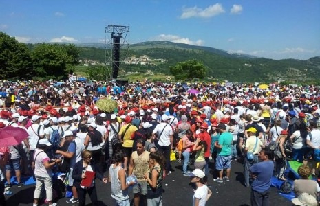 A Fájdalmas Szűzanya kegyhelye előtt gyűltünk össze, amely azon a helyen épült, ahol ennek a földnek két leánya, Fabiana és Serafina, 1888-ban Isten Anyja látomásában részesült, miközben a földeken dolgoztak. Mária mindig segítségünkre siet: amikor dolgozunk, amikor munkát keresünk; legyenek bár világosak vagy zavarosak gondolataink; amikor imánk spontán fakad szívünkből, és akkor is, amikor szívünk sivár. Sok-sok férfi és nő, fiatalok és idősek fordultak Máriához, Isten és a mi anyánkhoz, az Egyház anyjához, hogy köszönetet mondjanak neki vagy kegyelemért könyörögjenek hozzá. Mária Jézushoz vezet el bennünket, és Jézus adja meg nekünk a békét. Forduljunk Máriához bizalommal, kérjük segítségét bátran és reménnyel. Az Úr áldjon meg mindnyájatokat – fejezte be a fiatalokhoz intézett beszédét Ferenc pápa, majd közösen elimádkozta velük az Üdvözlégy Máriát.