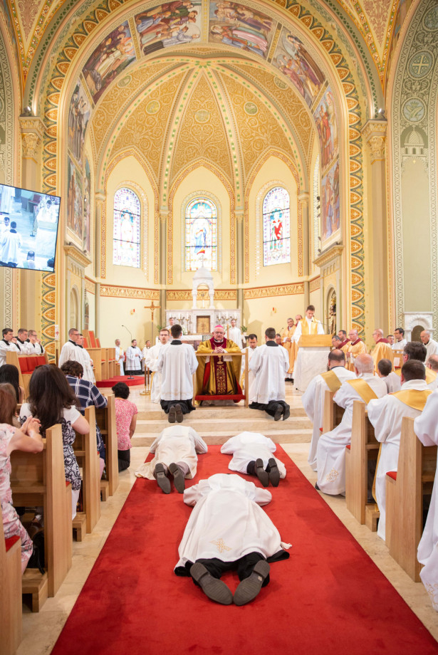 A homíliát követően a szentelendők ígéretet tettek az imára, a zsolozsma végzésére, a szolgálatra, majd az Egyház hagyománya szerint arcra borulva készültek fel a szentelés pillanatára, miközben a hívek a Mindenszentek litániáját énekelték.