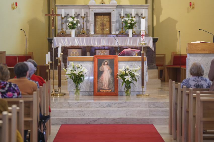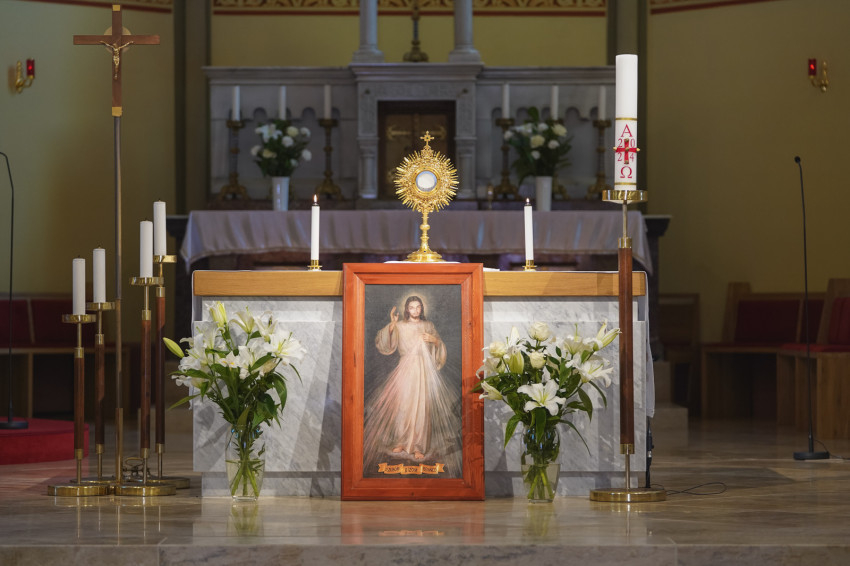 A főpásztor a szentségimádásról is szólva úgy fogalmazott: a szentségimádás legegyszerűbb megfogalmazása számomra: szeretettel szemlélni a Titkot. Mit jelent ez? „Szeretettel” azt jelenti, hogy osztozni akarok vele. Ő megosztja magát velem, a saját létét, életét; én megoszthatom vele minden dolgomat. A szemlélés azt jelenti, hogy nem irányítom a kapcsolatot, hanem befogadom, és engedem, hogy hasson rám, formáljon, változtasson. Hiszen a feltámadt Krisztussal való találkozás gyümölcse az evangéliumokban mindig a változás. Akik találkoztak a Feltámadottal, azok megváltoztak. Számomra a feltámadás egyik legnagyobb bizonyítéka a jelenben, hogy ma is megváltoztatja azoknak a szívét és életét, akik találkoztak vele. Belülről formál át bennünket – mondta Varga László püspök. – Akit szeretek, azzal osztozom, és aki szeret, az osztozik velem.
