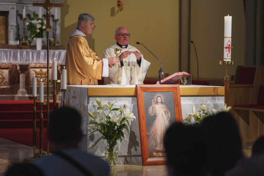 Az előadást követően gitáros szentségimádás, majd szentmise következett, amelyet Varga László püspök és Varga Péter plébános mutatott be.