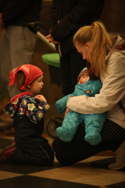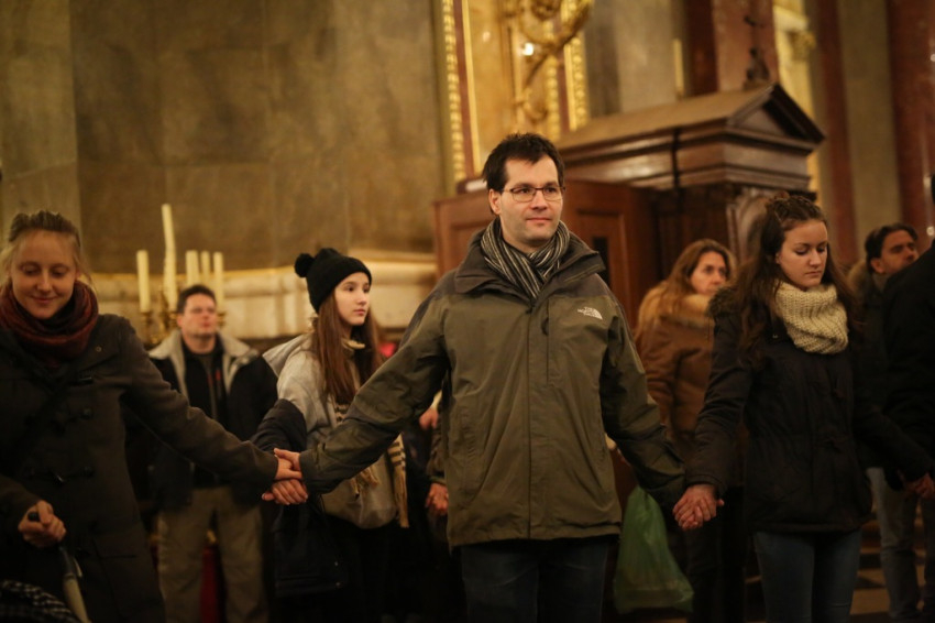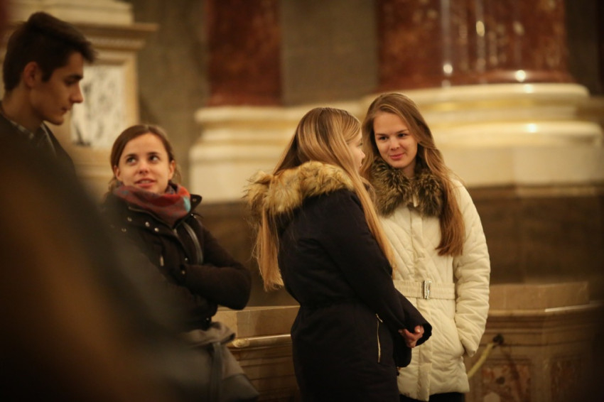 A templom mégis másképpen zsibong, mint a tér előtte, ahol már tombol a karácsonyi vásár, és a bazilika lábánál meghökkentő módon egy megnyerhető, szalaggal átkötött autó hirdeti, mi a fontos – odakint. A betlehem alakjai Máriától a pásztorokig egyaránt megdöbbent tekintettel figyelik a zűrzavart.