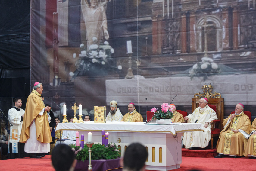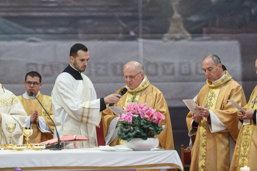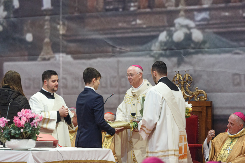 A szentmise kezdetén fiatalok verssel és virággal köszöntötték a főpásztort, majd Michael W. Banach érsek, apostoli nuncius mondott köszöntőt, tolmácsolva Ferenc pápa jókívánságait, aki lelki és atyai közelségéről, imádságáról biztosította az ünnepeltet.