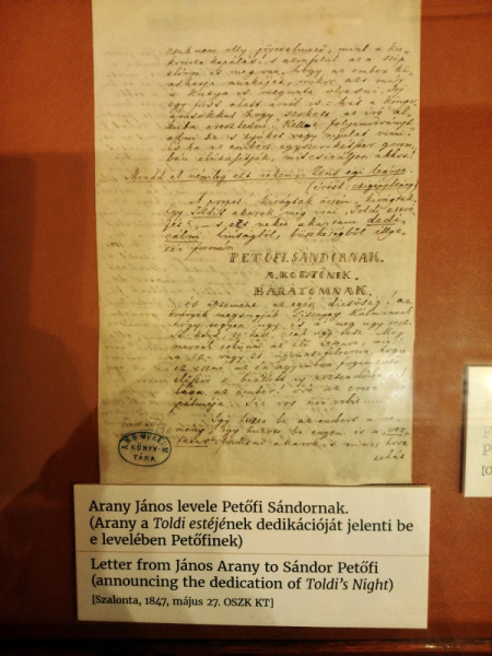 A tárlaton szép aranyos keretben látható 1849-ből a Nemzeti dal első példánya is, amelyet Petőfi küldött el Arany Jánosnak. A tárlókban helyet kapott Arany és Petőfi levelezésének számos darabja is. Az egyik borítékon például ez áll: „Petőfi Sándor honvéd-századosnak, a 28. zászlóaljnál.” S a címzés: Debrecenben Telegdi Lajos könyvárus úrnál. A boríték aradi pecséttel van ellátva.