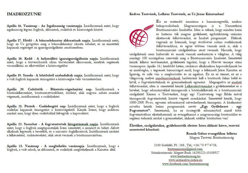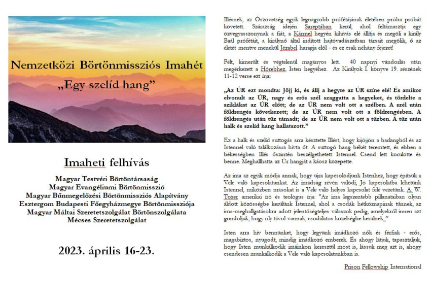 A Magyar Testvéri Börtöntársaság, a Magyar Evangéliumi Börtönmisszió, a Magyar Bűnmegelőzési Börtönmissziós Alapítvány, az Esztergom-Budapesti Főegyházmegye börtönmissziója, a Magyar Máltai Szeretetszolgálat börtönszolgálata és a Mécses Szeretetszolgálat börtönpasztorációs társaságközös kezdeményezésében arra hívnak, hogy április 16. és 23. között együtt imádkozzunk a fogvatartottakért.