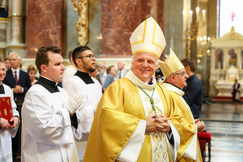 A szentmise végén a záróáldás szövegét Erdő Péter bíboros együtt mondta az új segédpüspökkel. A szertartás a pápai és a magyar Himnusz eléneklésével ért véget.