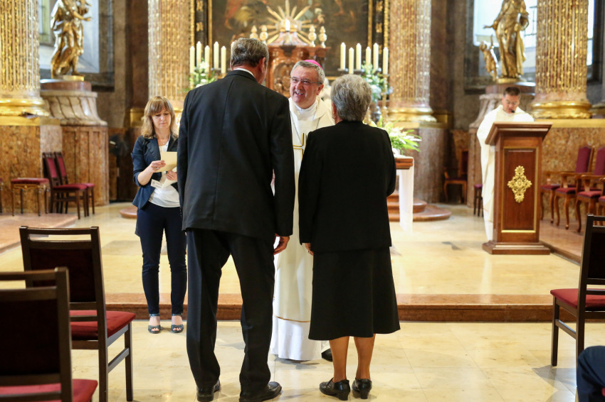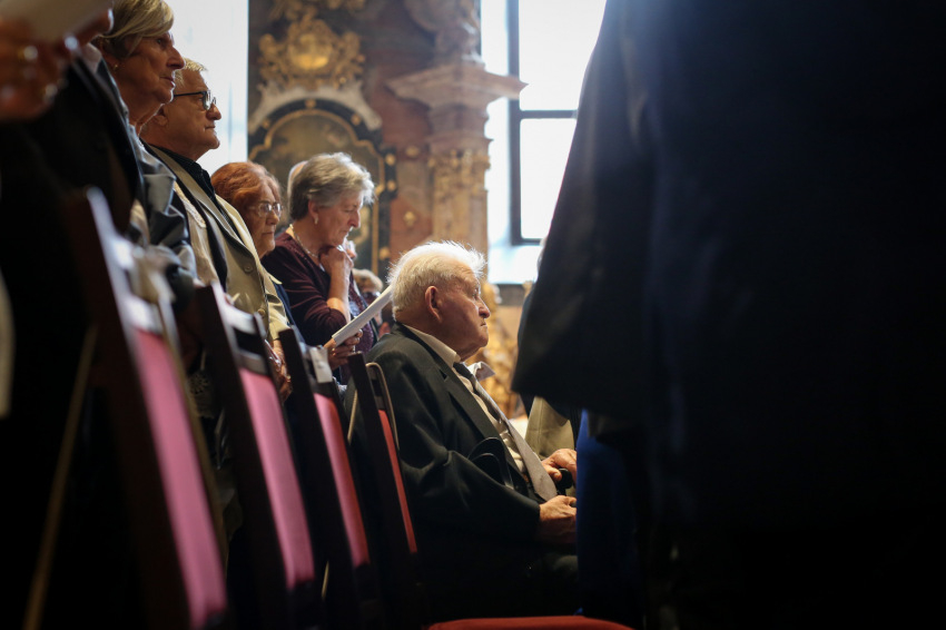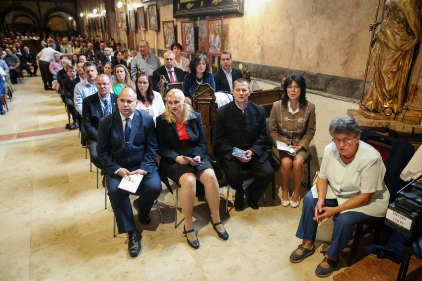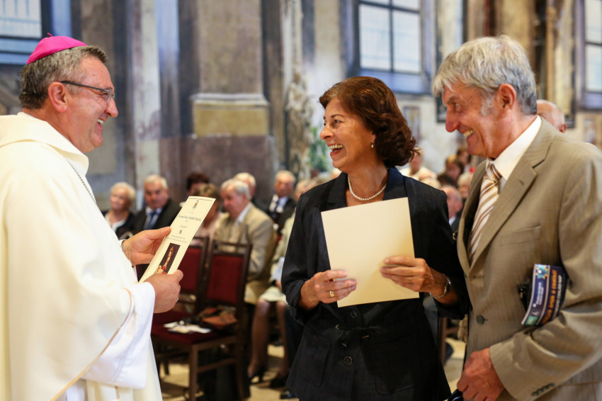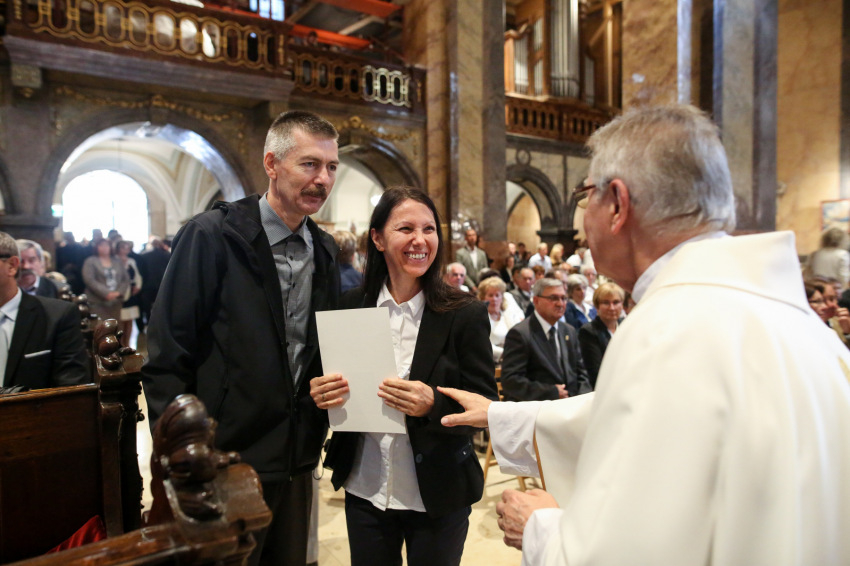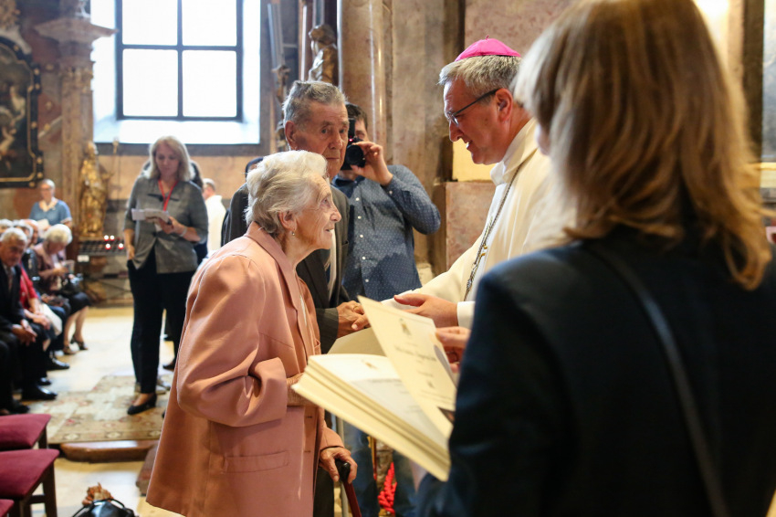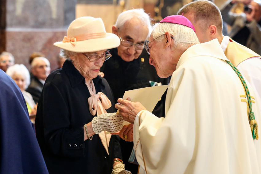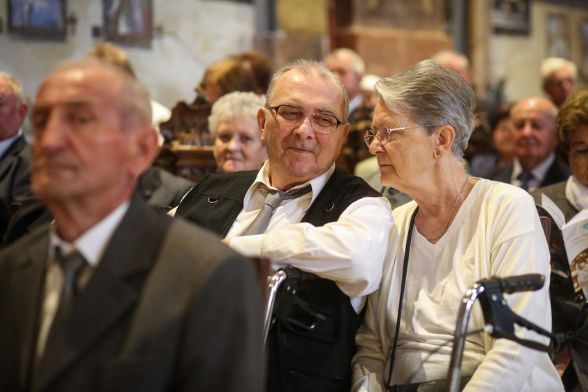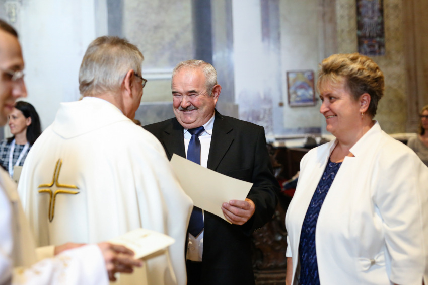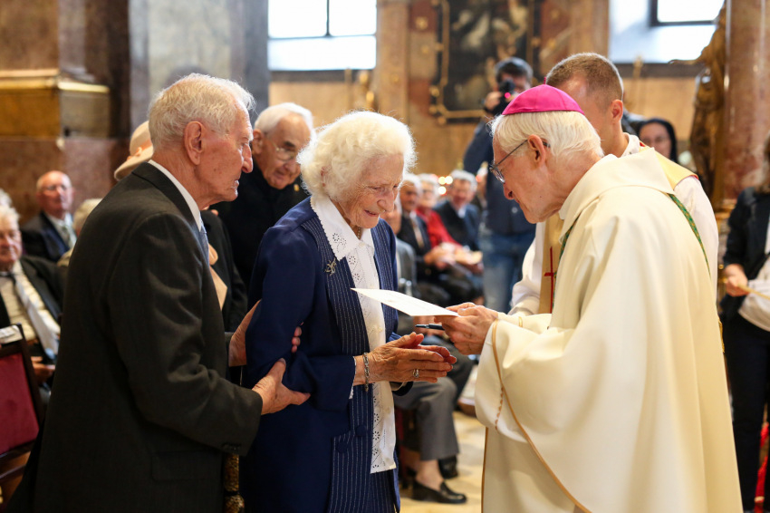 Aztán megkezdődik az emléklapok átvétele. Ez a több mint fél órán át tartó esemény a templom lassú kiürülésével együtt olyan, mint valami ősi, méltóságteljes szertartás, „seregszemle”. Elhangzanak a nevek, az együtt töltött évek száma, majd látom, ahogyan a lapjukért mennek és visszatérnek, a püspökvár kertjébe indulnak a párok. Nagyon-nagyon sok az ötvenéves jubileum.