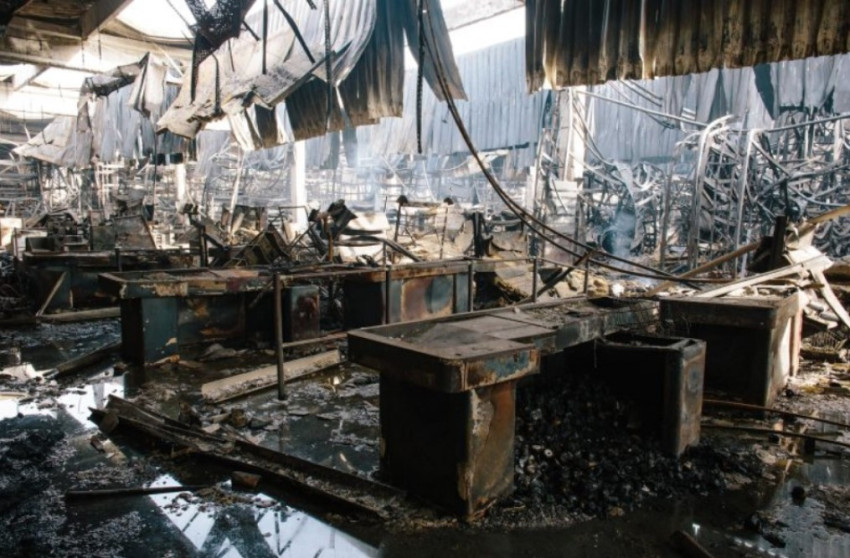 Az ukrán közösségi oldalakon közzétett képeken látható, hogy az áruház tetőszerkezete felszakadt, és hatalmas fekete füstoszlop gomolygott ki belőle. A hatóságok szerint az építmény 10 ezer négyzetmétere leégett. Grigorij Szemenkov szerint szerencsére a lángokat sikerült eloltani, és a tűzoltóknak sikerült a helyzetet ellenőrzésük alá vonni. Ezután be tudtak jutni az épületbe, hogy keressék az eltűnt személyeket, a tűzoltók pedig oltották a támadások miatt keletkezett lángokat.