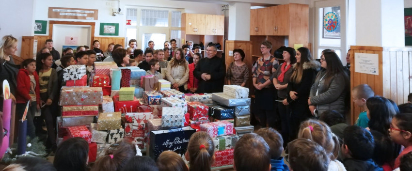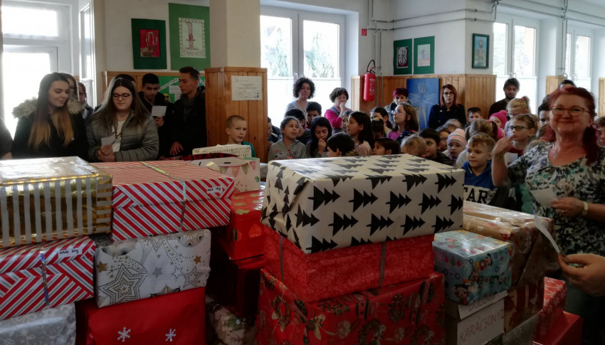 A gyerekek épp szünetre indultak, mikor azt látták, hogy két megpakolt autóból gyönyörűen becsomagolt ajándékdobozokat hordanak be „nagy” idegen diákok az iskolánkba. Ennyi csodaszép ajándék még soha nem volt nálunk, pontosan 122 darab. Tapintani lehetett az izgalmat, a várakozást, a meglepődést. Záporoztak a kérdések: „Ezeket mind mi kaptuk?… Honnan van?... Mi van benne?… Jaj, de szép! Mikor kaphatjuk meg?...”