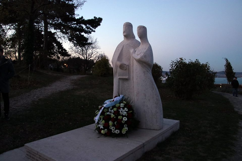 Ezt követően a Pisky sétányon megkoszorúzták az alapító királyi pár szobrát, emlékezve arra, hogy a török kor, a végvári időszak elmúltával, háromszáz éve, 1719-ben tértek vissza a magyar bencések az ősi falak közé.