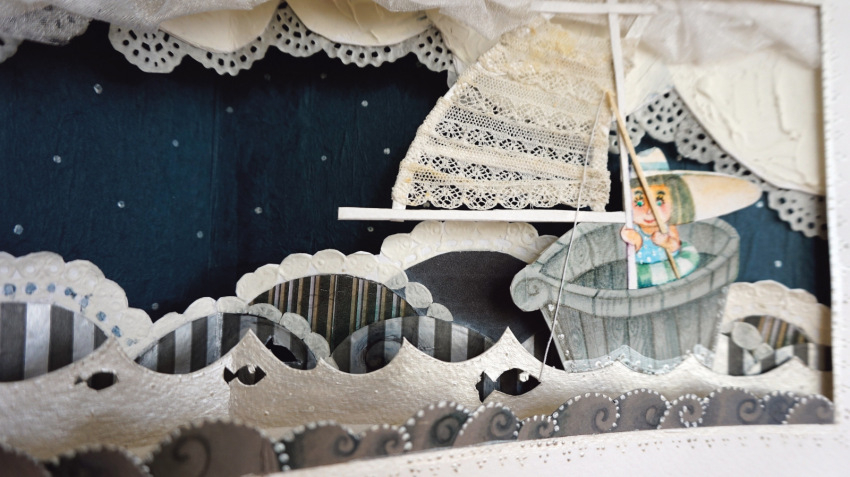 Harminc év alatt mesekönyv-illusztrációk tengere került ki Faltis Alexandra keze alól, de készített animációs filmeket, báb-, jelmez- és díszletterveket is. Az utóbbi években született vegyes technikájú művei, montázsai, kollázsai azt bizonyítják, hogy képes a művészi megújulásra. Ez utóbbi alkotásai közül most csak a kevesek által ismert, még nem publikált „művészkönyvének” egyik parádés darabját mutatjuk be: egy többdimenziós hatású kompozíciót, amelynek textil- és papírelemei között egy kékszemű kislány hajókázik a tengeren. Alexandra szeretettel és hálával gondol vissza az évtizedek során Párizstól Ankaráig számos helyszínen kapott elismeréseire, vagy a 2009-es és 2011-es Szép Magyar Könyv versenyen elnyert díjaira, most azonban nem ezekből a díjnyertes munkáiból mutatunk be két szemelvényt, hanem A zöld kaftán című varázslatos Krúdy-kötetből, amely az Unikornis Kiadó Nagy magyar mesemondók sorozatában jelent meg.