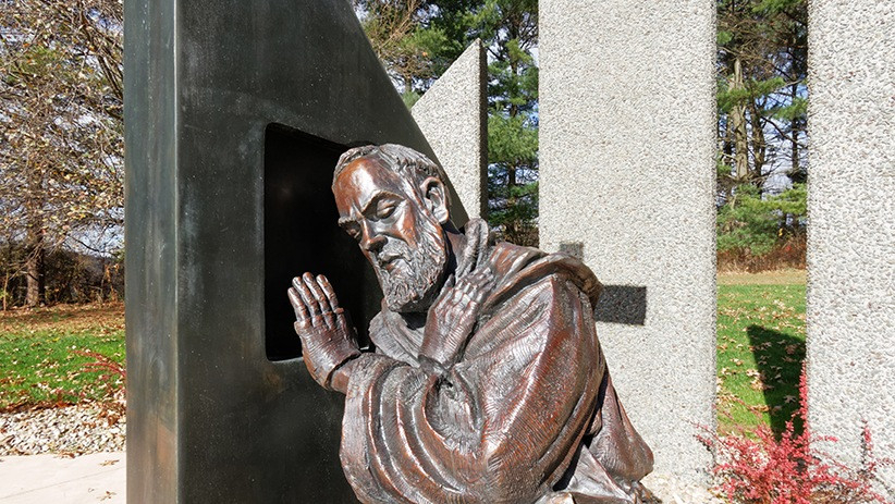 Timothy P. Schmalz alkotása egy stilizált gyóntatószék, a közepén egy több mint két és fél méter magas feszület áll. Pio atya az egyik oldalon ül a stigmát takaró kötéssel a kezén. Arcát és egyik kezét a gyóntatószék ablakához érinti, mintha éppen egy gyónást hallgatna. A másik oldalon van egy ülőke, ahova bárki leülhet, imádkozhat – ám onnan nem látni Pio atya alakját: a gyóntatószék ezen oldalán a keresztre feszített Krisztus arca és átszúrt keze jelenik meg.