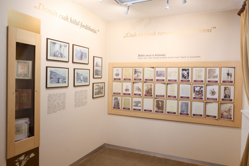 Az emeleti szobákban a Babitsról, a nagyszüleiről, szüleiről, és nagynénjéről készült fényképekkel találkozhatunk. A vitrinben pedig családi tárgyakkal, így például borospince kulcsával vagy Arany János Toldi szerelme című elbeszélő művének egy példányával is, amelyből Babits édesanyja hosszú részleteket tudott kívülről. Láthatunk egy kéziratos ajánlást is az ajándékkötetben, amit Babits az édesanyjának írt: „A régi század utolsó karácsonyán ajándékozza hű fiad, Misi.”