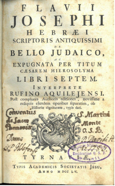 Az 1700-as évek közepén kiadott kötet címlapján több bencés, a pannonhalmi monostorhoz és egyes szerzeteshez köthető kézírásos possessori – azaz tulajdonosi – bejegyzés látható, valamint a kőszegi rendház pecsétje. Josephus Flavius műve előtt pedig egy úgynevezett „libellus graduális” található.