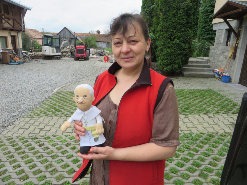 Útban Csíksomlyóra két éjszakát töltöttünk el a panzióban férjemmel együtt, természetesen vacsorakor a házi finomságok mellett komoly témák is az asztalra kerültek, többek között a közelgő pápalátogatás. Marika szomorúan adta tudtunkra, hogy sajnos ő csak a televízión keresztül tud részese lenni a történelmi eseménynek, mivel szombat este újabb nagy létszámú csoportot lát vendégül, nekik kell főznie. „Na, majd megkérjük a pápát, hogy a tévén keresztül integessen neked! – tréfálkoztam, majd kezébe adtam a pápa-plüssfigurát – Nézd csak, hozzád látogatott el elsőként Ferenc pápa!”