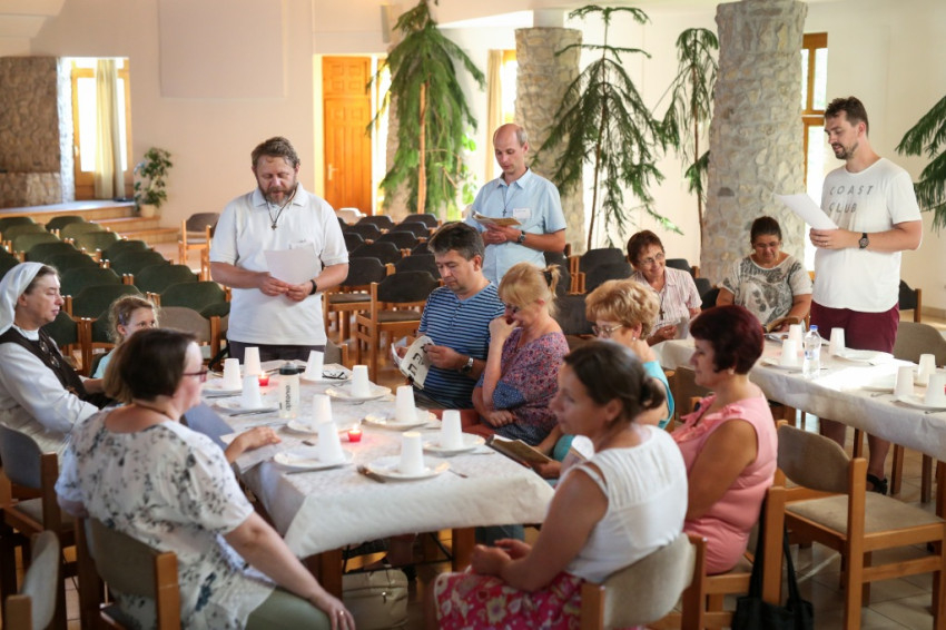 Balázs holnap előadást is tart, János evangéliumának hatodik fejezetéről; arról a részről, amely a lelkigyakorlat mottóját is adta: „Uram, kihez mennénk? Az örök élet igéi a tieid.” Jézust ekkor sokan elhagyják, mert nem értik, mit jelent, amikor a testét kínálja ételül. Mi segít a nem értés ellenére is hinni és Jézus mellett maradni: erről szól ez a lelkigyakorlat. Jézus a legmélyebb éhségünkre válaszol, válasza azonban szétfeszíti az emberi gondolkodás kereteit. Az ember olyan, hogy hajlik mindig annak helyeselni, aki saját nézeteinek, gondolkodási rendszerének megfelelően beszél. Jézus viszont többet akar adni: ki akar hívni a megszokott kereteink közül.