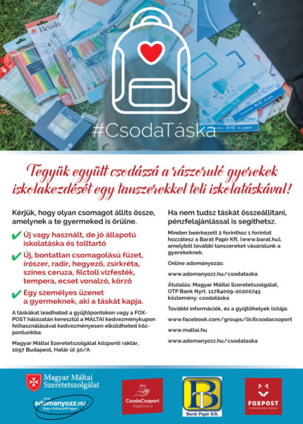 Az iskolatáska, a tolltartó, a füzetek, az írószerek és a tanuláshoz szükséges további eszközök beszerzése sokszor elérhetetlen a nehéz helyzetben élő, többgyermekes családoknak. A legszegényebb településeken felnövekvő gyerekek már azzal is hátrányba kerülhetnek az iskolában, hogy hiányzik a füzetük, nincs színes ceruzájuk vagy vonalzójuk. Lemaradnak a tanulásban, kudarcok érik őket, akár szorongás is kialakulhat náluk. A gyűjtéssel nekik segít a CsodaCsoport Alapítvány és a Magyar Máltai Szeretetszolgálat. A szervezők azt kérik, hogy aki teheti, új vagy jó állapotú iskolatáskát megtöltve állítson össze iskolakezdő csomagot egy alsós vagy felsős gyermek számára.