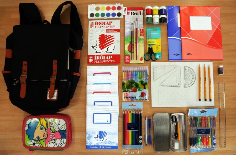 Amit érdemes a táskában tenni: új füzetek alsó és felső tagozatos gyerekek számára (vonalas, négyzetrácsos, szótár, kotta, sima füzet, A/5, A/4, spirál), tolltartó, ceruzák, tollak, vonalzó, radír, hegyező, körző, színes ceruzák, filctollak, vízfesték, tempera, ecset, írólap, rajzlap, papírvágó olló.